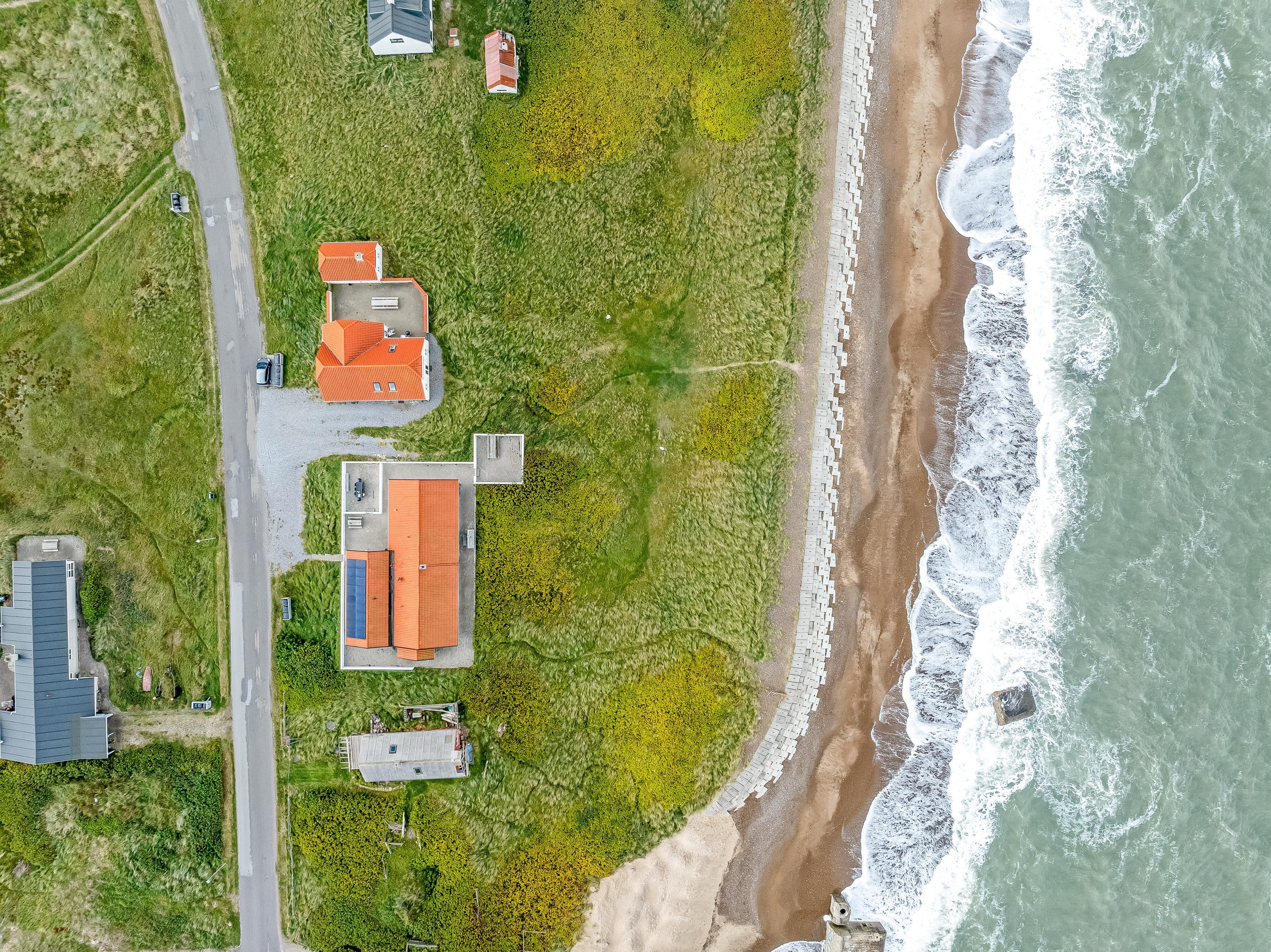 Huset ligger på en stor 1500 kvadratmeter naturgrund, kun 50 meter fra havet, hvor du kan nyde den friske havluft og bølgernes beroligende lyd. Der er en rummelig terrasse på 130 kvadratmeter og praktiske faciliteter, som opladning til elbil og parkering ved huset.