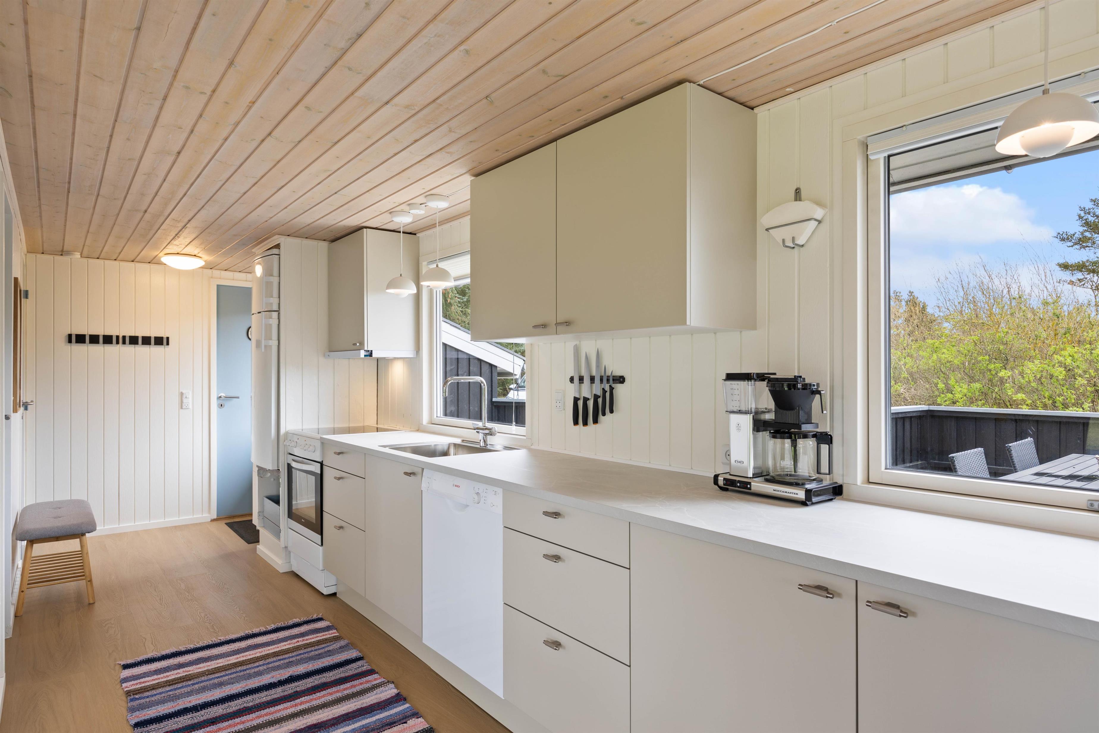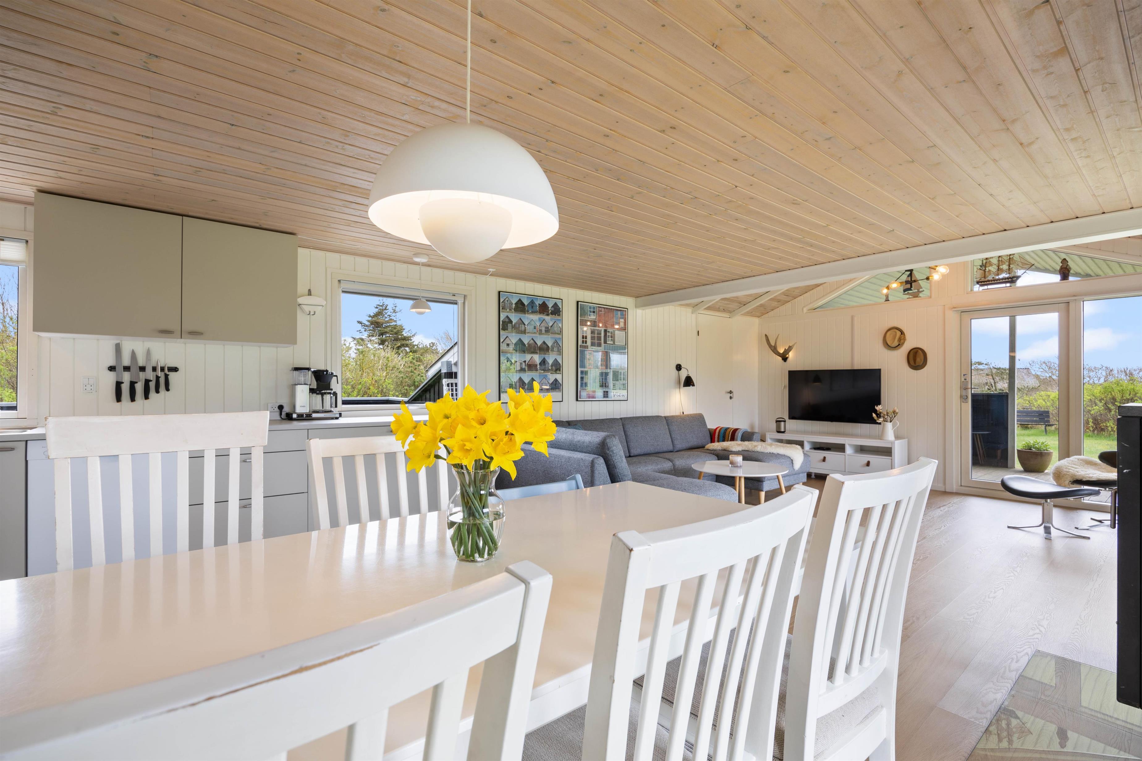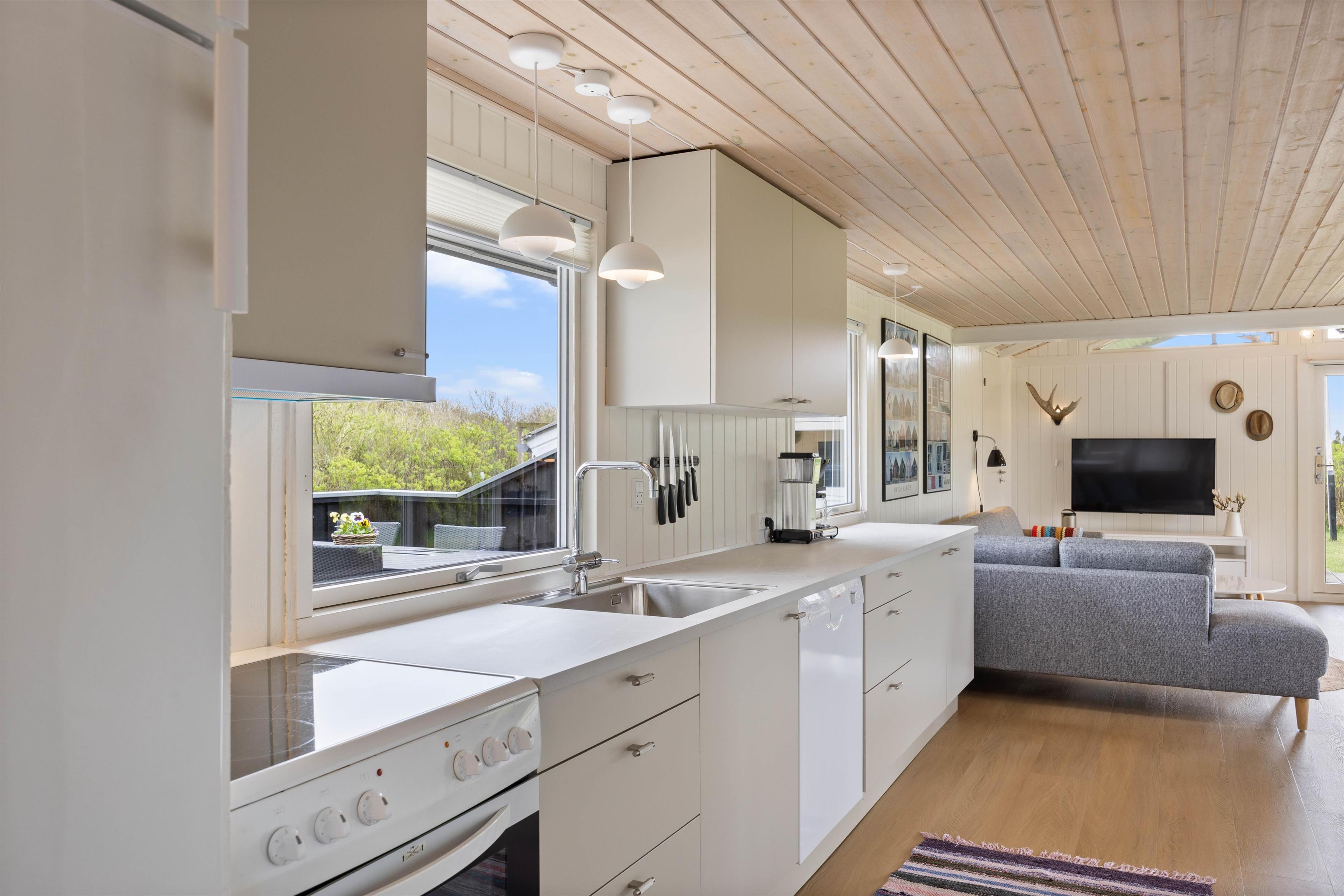 Feriehuset er lyst og indbydende, og i stuen er der store vinduespartier, så du får naturen helt tæt på. På de køligere dage vil du sikkert nyde at sidde med ild i brændeovnen, en god bog og udsigten til naturen i baggrunden. Chromecasten i huset giver jer også mulighed for at streame en god film eller serie.