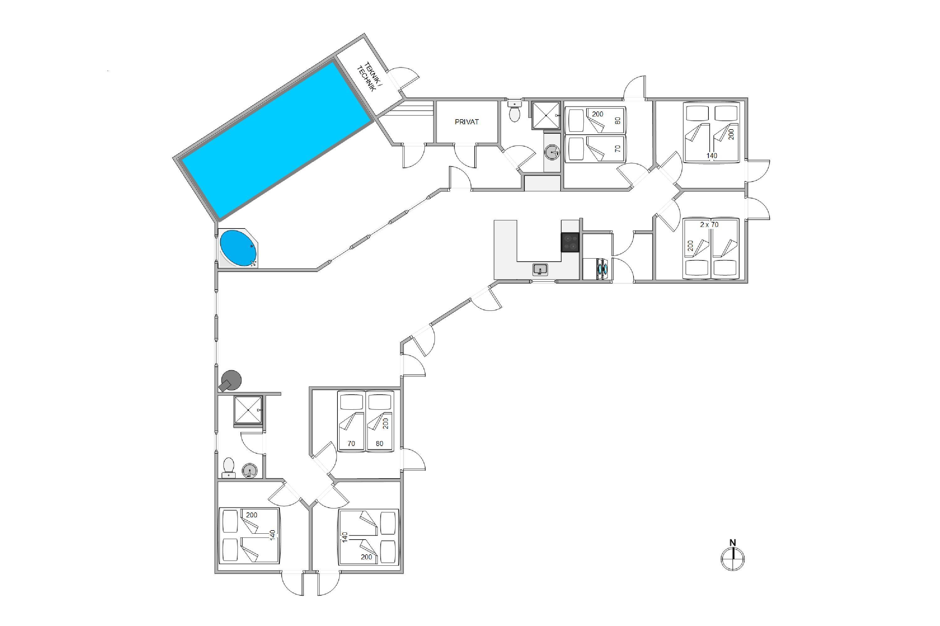 De 12 sovepladser er fordelt på 6 soveværelser – alle med dobbeltseng. Der er tre soveværelser i hver sin ende af sommerhuset, og sommerhuset er derfor oplagt til 2 familier. Yderligere befinder de to badeværelser sig også i hver deres ende, så hver familie kan få sit eget. Begge badeværelser har indbygget gulvvarme.