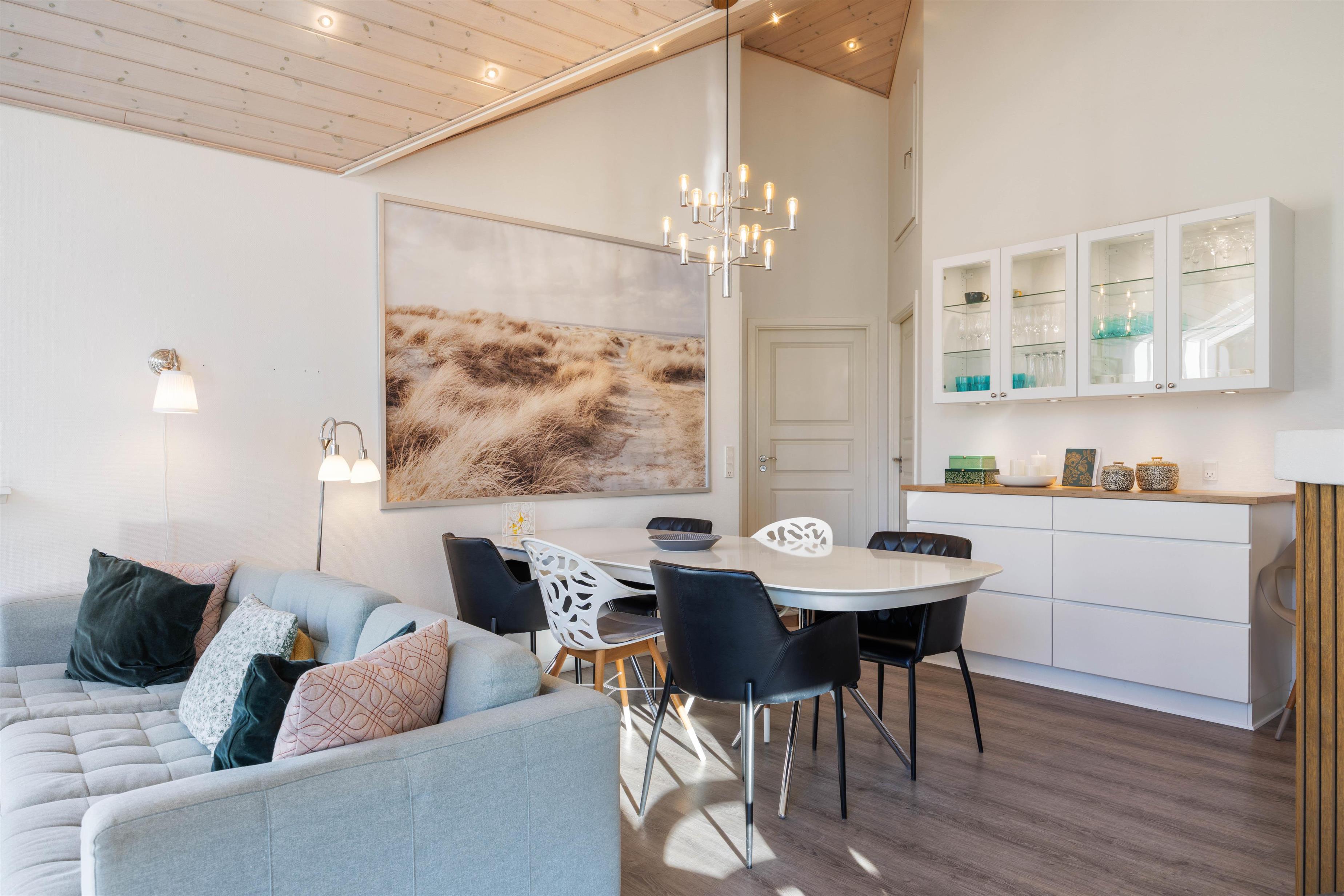Det lyse og åbne opholdsrum er husets hjerte og samlingspunkt. Brændeovnen kan ses og nydes både fra spiseområdet, i sofaerne og fra det åbne samtalekøkken. Køkkenet er stort, veludstyret og har naturligvis opvaskemaskine.