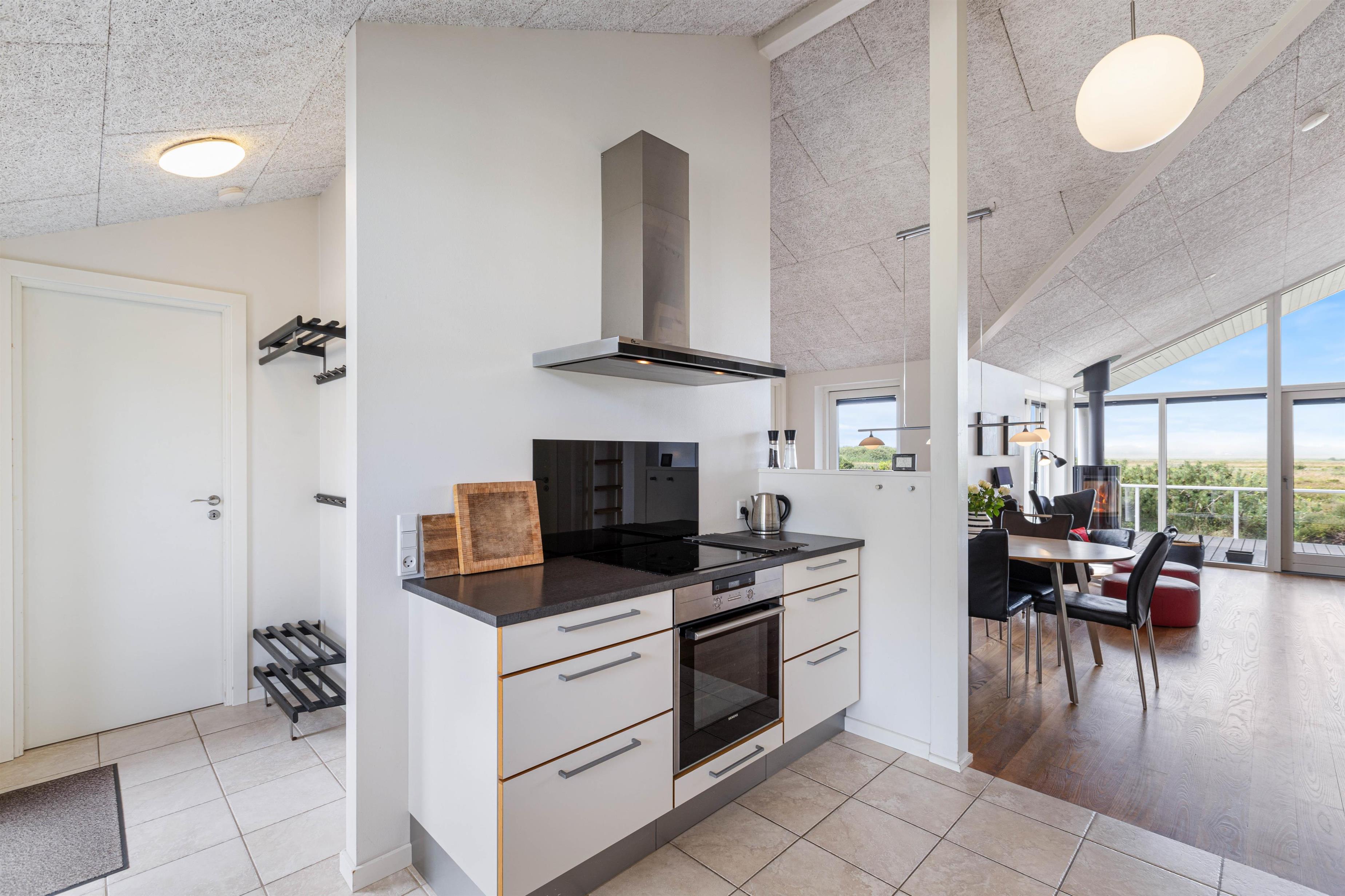 Sommerhuset kan snildt rumme op til 8 personer, og det rummelige køkken-alrum inviterer til mange gode stunder med jeres nærmest. Her går loftet hele vejen til kip hvor der monteret er akoustikvenlige troldteksplader, der sammen med brændeovnen er med til at skabe en dehlig atmosfære. Sommerhusets fladskærms-TV med tilhørende chromecast giver jer mulighed for at nyde jeres yndlingsunderholdning lige netop når det passer jer bedst. I kan også fra sofaafdelingen nyde en dejlig udsigt, hvor I kan sætte jer godt til rette og nyde en god bog eller andet underholdning.