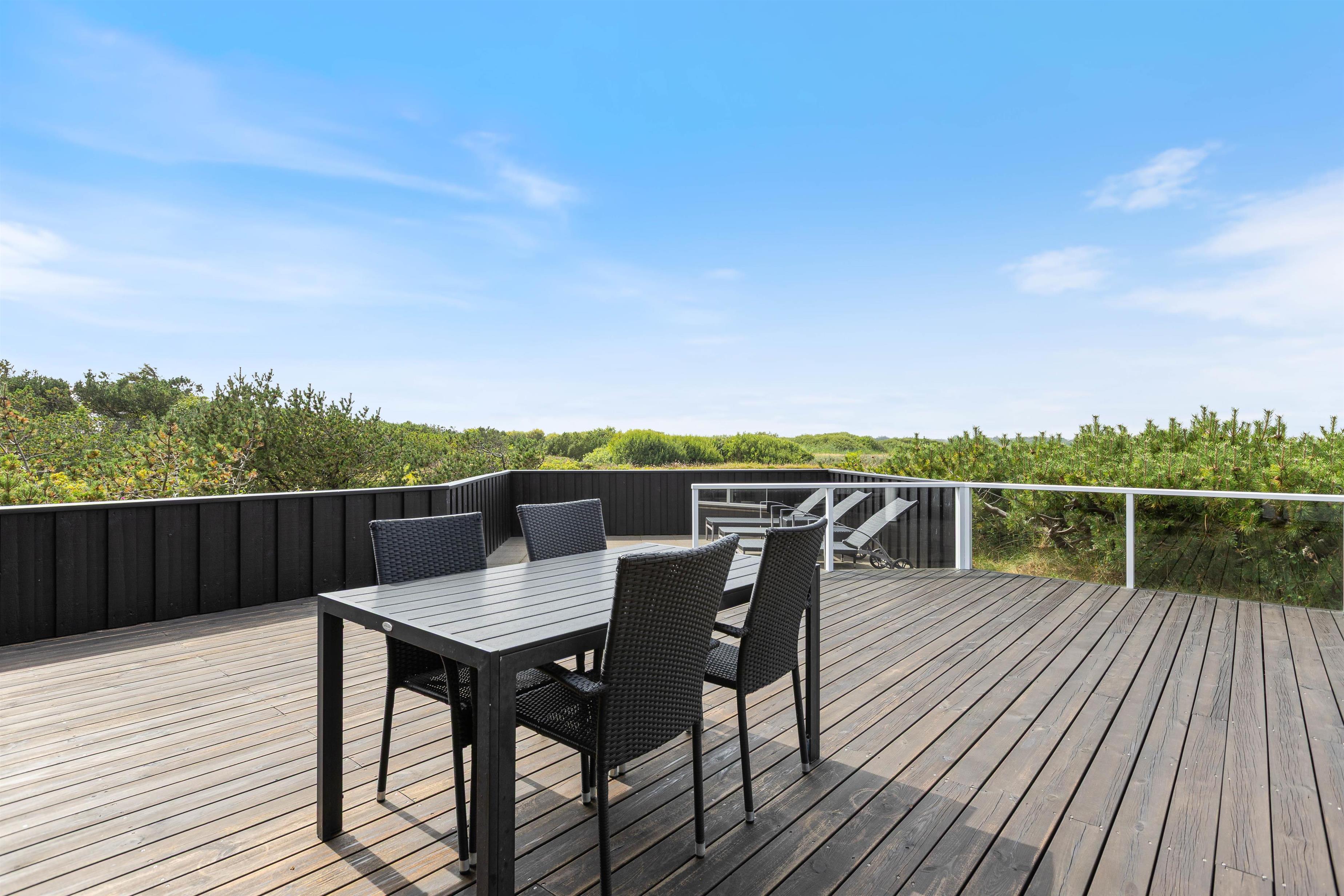 Naturgrunden, som huset er placeret på, er beskyttet af træer mod syd, som giver masser af læ og privatliv på terrasserne. Den meget store terrasse går hele vejen rundt om huset. Mod øst er der en delvist afskærmet terrasse – perfekt på dage med blæsevejr og helt ideelt til morgenkaffen. Mod vest er terrassen lukket og yderst mod vest er den endvidere sænket, så solelskere vil elske den. Har man mindre børn med, vil de elske legetårnet og sandkassen, som er placeret øst for huset. Vesterhavet er kun ca. 20 minutters gang fra feriehuset og den hyggelige badeby Søndervig er kun 5 minutter væk i bil.