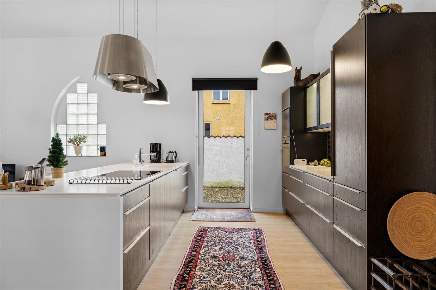 Køkkenet er udstyret med 1 køleskab. Der er 4 induktionskogeplader, varmluftovn, mikrobølgeovn samt opvaskemaskine.