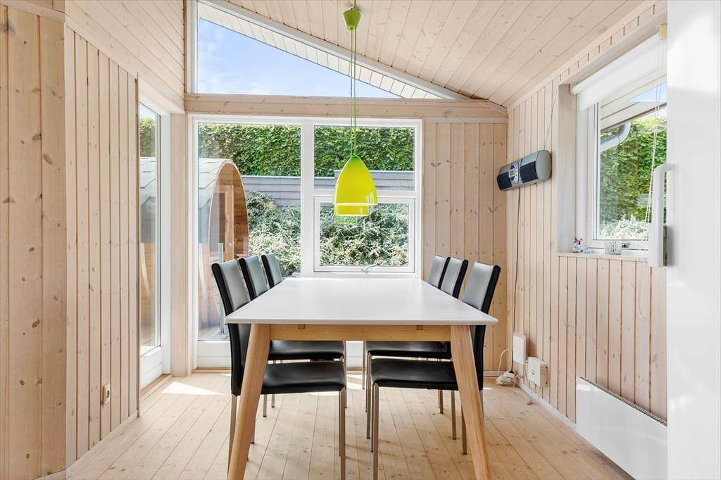 Da sommerhuset blev opført i 2010, blev det placeret helt rigtigt på grunden, så I får størst glæde af fjordudsigten. Stuen er udstyret med et kæmpe vinduesparti, der går fra gulv til loft, og takket være opholdsafdelingens åbne forbindelse, kan I også beundre vandomgivelserne, når I står i køkkenet. To af de tre soveværelser vender som tidligere nævnt også ud mod fjorden, og fra det ene har I endda direkte adgang til terrassen. Sommerhuset har for øvrigt god wi-fi-forbindelse og fladskærms-tv med Chromecast, og det store badeværelse er på lækker vis indrettet med spabad.