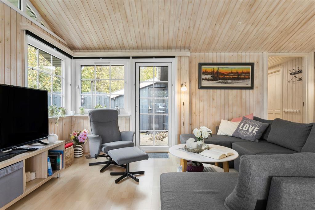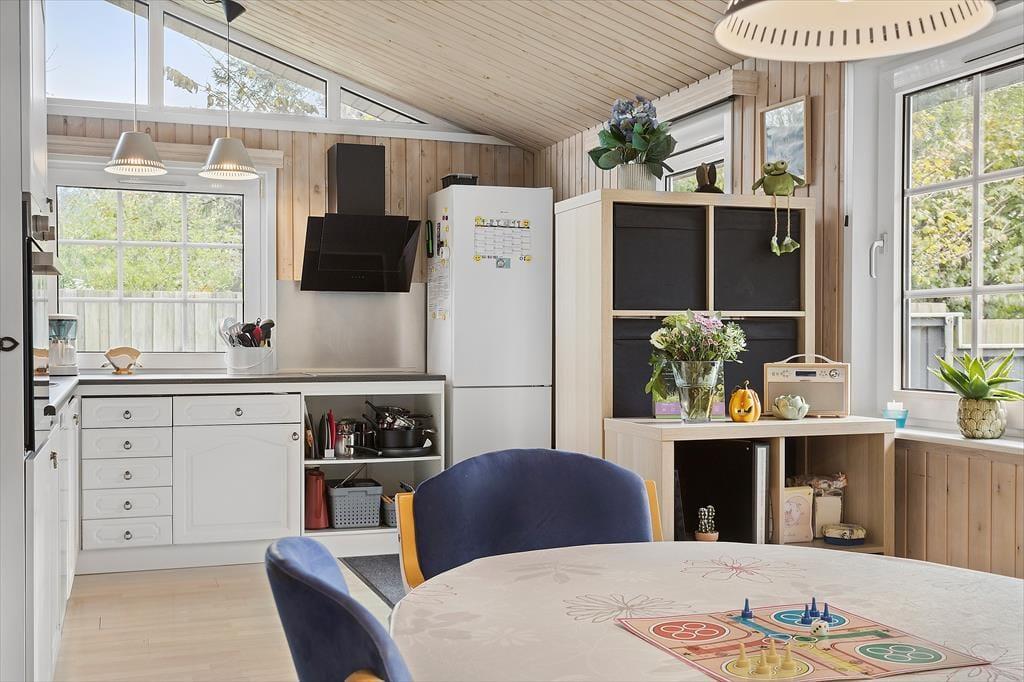 Inden døre i sommerhuset har I 106 veldisponerede kvadratmeter at brede jer på. Den lyse træbeklædning på vægge og lofter er noget af det, der bidrager til husets charmerende atmosfære, og stuens brændeovn er med til at give rummet den helt rette feriefornemmelse. Skal der virkelig hygges igennem med brætspil, snacks og filmaftener, er stuen et skønt opholdssted – og det er også her, I kan kokkerere i det åbne og velindrettede køkkenafdeling. På badeværelse er der badekar, hvis I trænger til et varmt og afslappende bad, mens gæstetoilettet er udstyret med vaskemaskine og tørretumbler, der gør det nemt at vaske tøj undervejs på ferien. Endelig byder planløsningen på tre rummelige værelser, der i alt kan rumme syv personer.