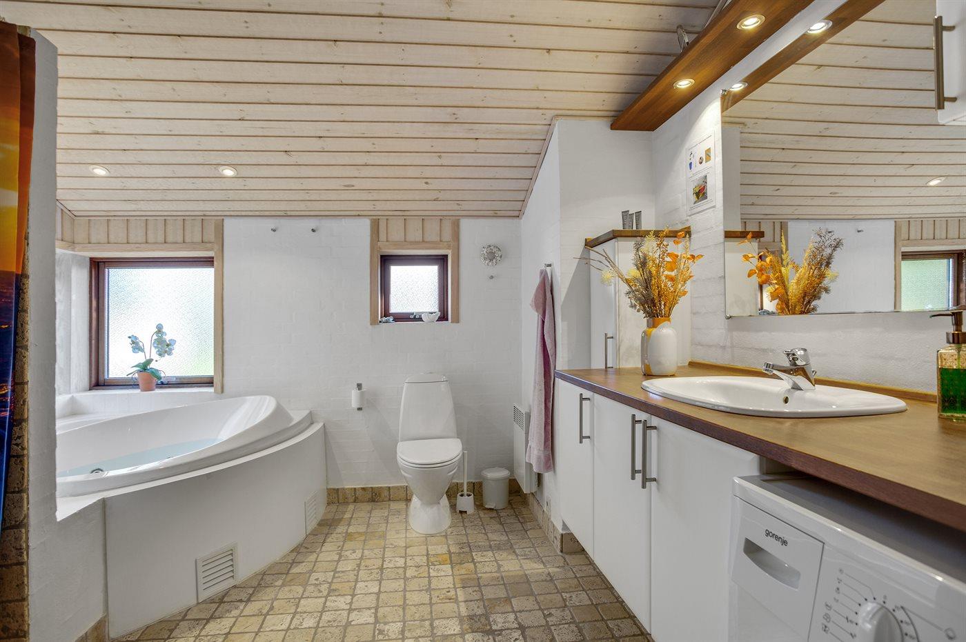 Der er 2 badeværelser med bruseniche og 2 toiletter. Der er gulvvarme på 2 badeværelser. I saunaen er der mulighed for afslapning.