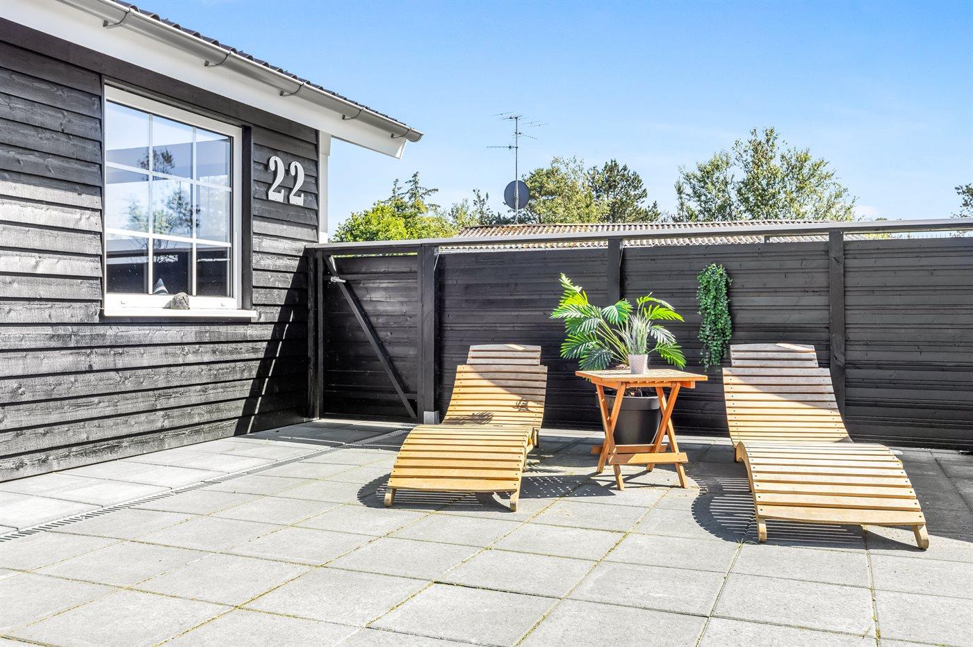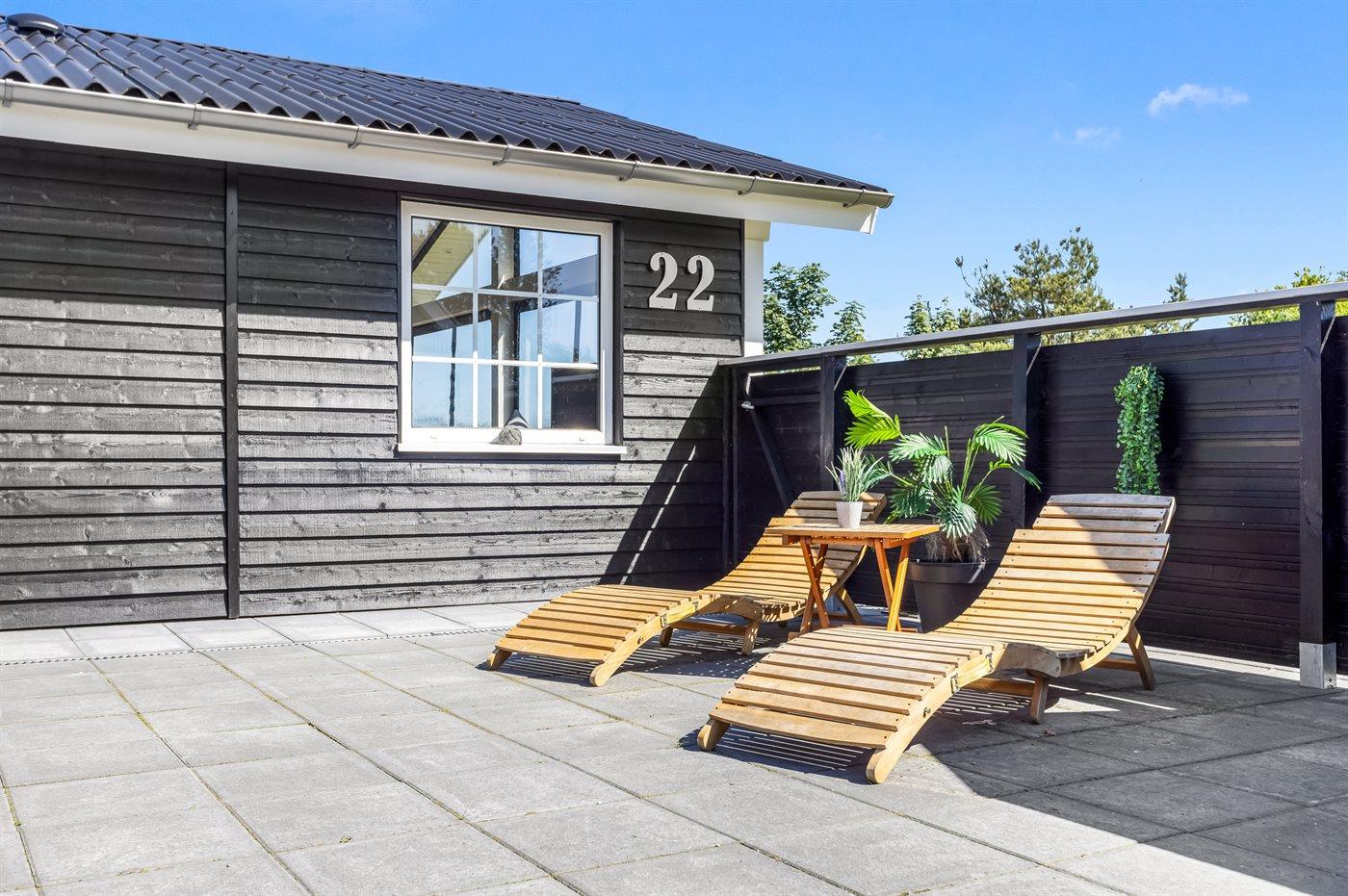 Ferieboligen er beliggende på en 1270 m² stor havegrund. Der er 400 m til havet. Nærmeste forretning er beliggende i en afstand af 3000 m. Til ferieboligen hører 48 m² terrasseareal. Desuden er der 24 m² overdækket terrasse. Gynge. Bålsted. Grill til rådighed. Der er carport til rådighed. Parkering ved ferieboligen.