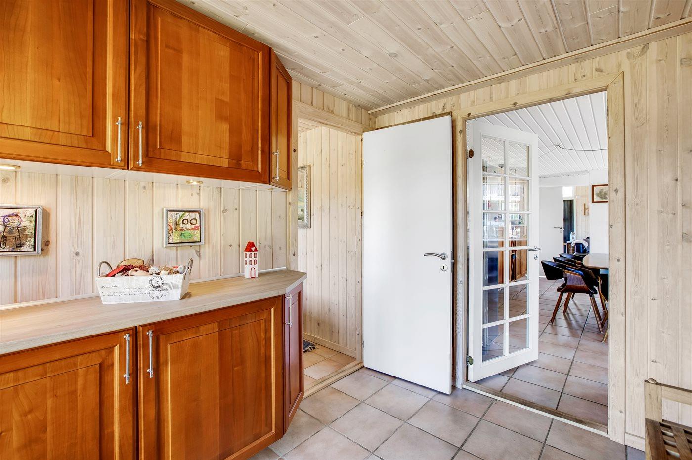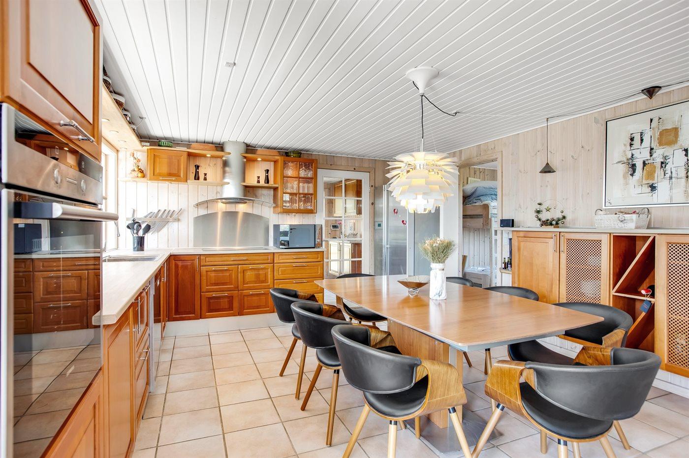 Køkkenet er udstyret med 1 amerikansk køleskab. Der er 4 keramiske kogeplader, miniovn, varmluftovn, mikrobølgeovn samt opvaskemaskine.