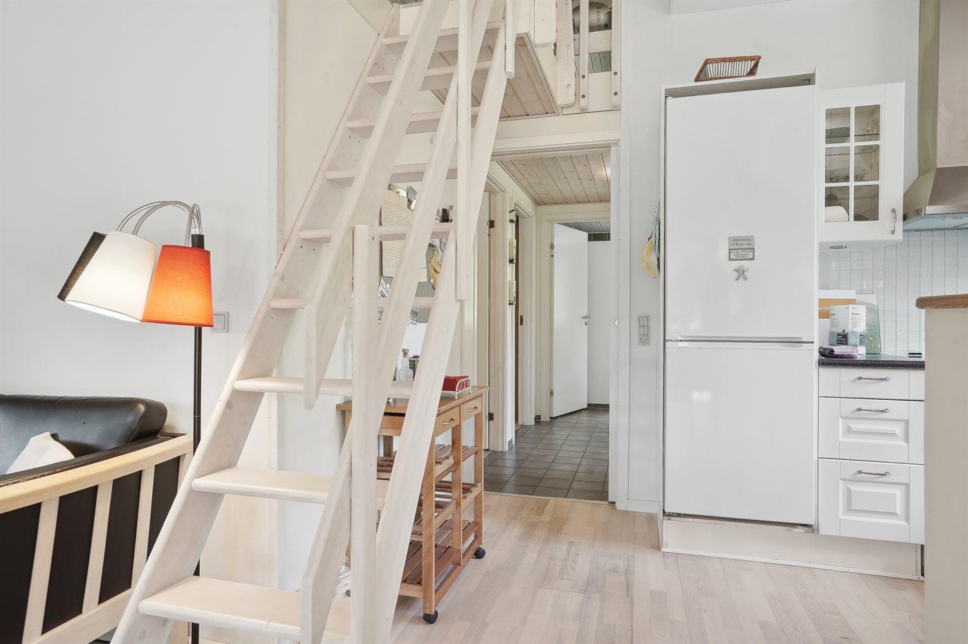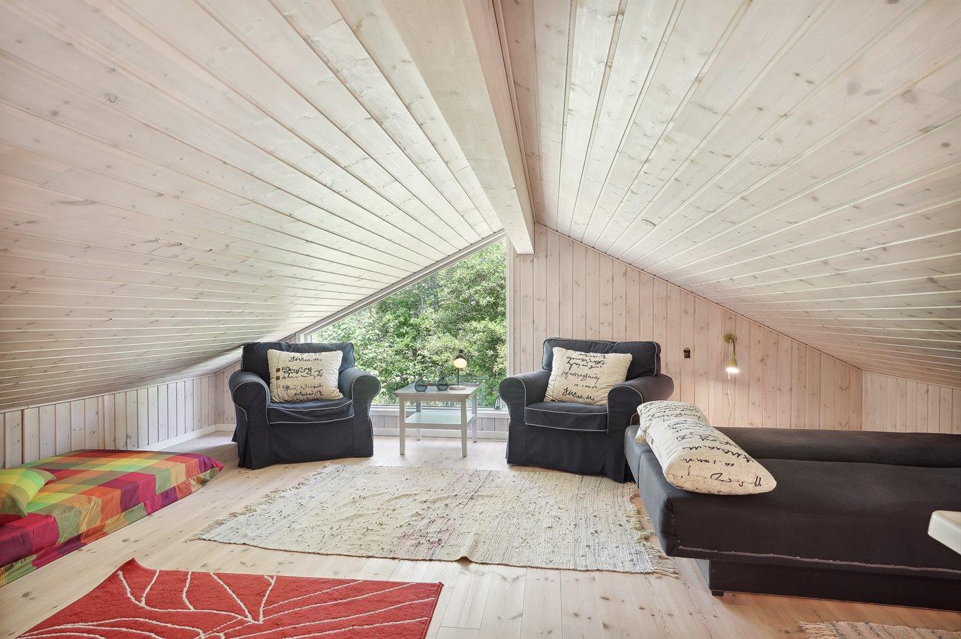 Inde i huset fører en trappe op til en hems med et par madrasser, hvor børnene kan være for sig selv og hygge med spil.
