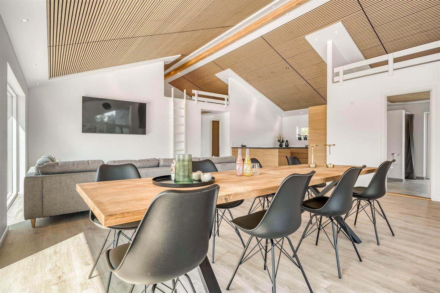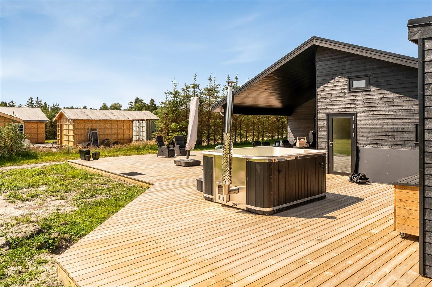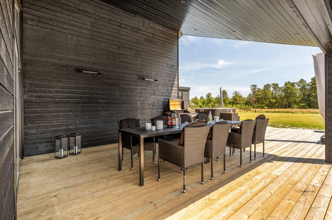 Den store terrasse omkranser hele huset og giver mulighed for at nyde solen hele dagen, mens den overdækkede terrasse skaber en hyggelig ramme til de lune sommeraftener. Her finder I også en luksuriøs udesauna, udendørs bruser og et vildmarksbad, der sikrer afslapning under åben himmel. Med en grill til rådighed kan I nyde hyggelige middage på terrassen og skabe skønne ferieminder i naturskønne omgivelser.