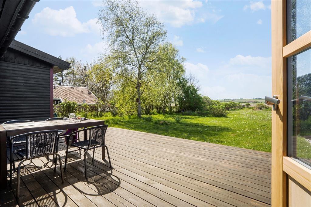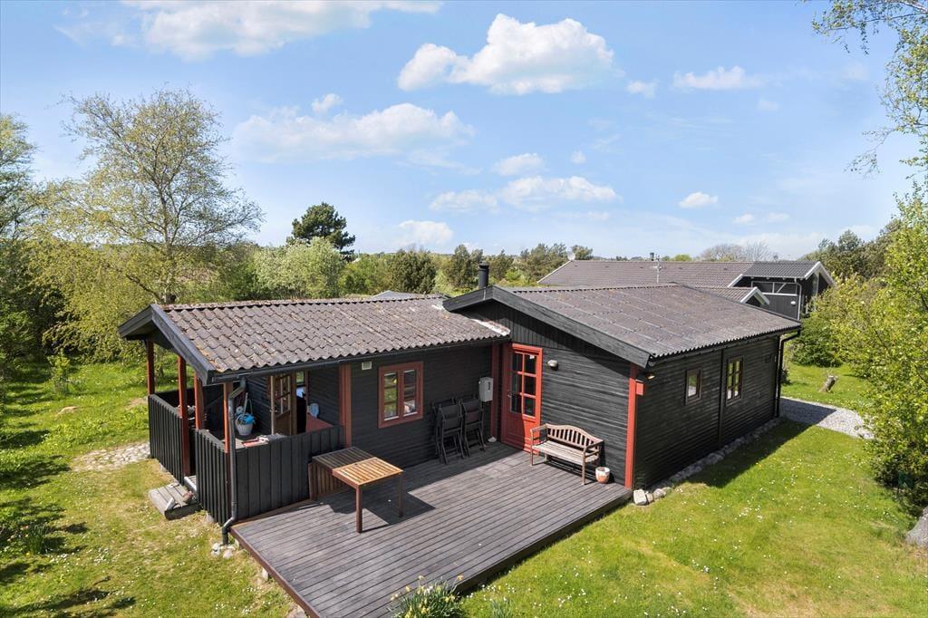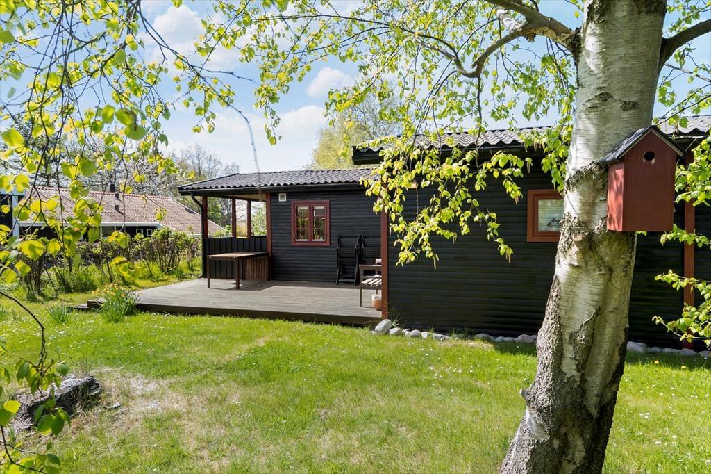 Huset ligger i den østlige ende af den store grund, så der er meget plads på plænen foran huset, hvor der også er en dejlig udsigt mod vest. Her kommer ofte rådyr og harer forbi, og det giver en god kombination af at være i et fredeligt sommerhusområde, og samtidig være i naturen. Buske og flere birketræer omkranser plænen, så samtidig med, at den gode udsigt er bevaret, er det også muligt at være ugeneret på terrassen og i haven.