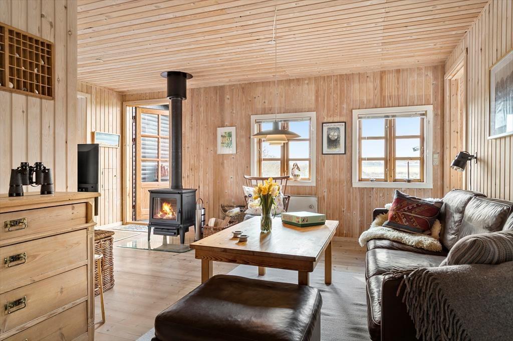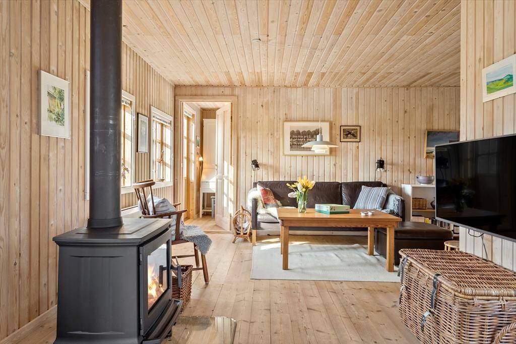 Overfor køkkenet er den hyggelige stue med sofahjørne og en brændeovn. Her er også et fjernsyn med en Chromecast, hvilket gør det muligt selv at vælge det indhold, du gerne vil se via mobil eller tablet og husets internet. Tænd op i brændeovnen og få en helt autentisk og hyggelig sommerhusstemning i den lille stue, hvor man kan fordybe sig i en god bog eller spille et spil. Fra stuen er der også udgang til en træterrasse, der er dejlig solrig og med udsigt ud over marker.