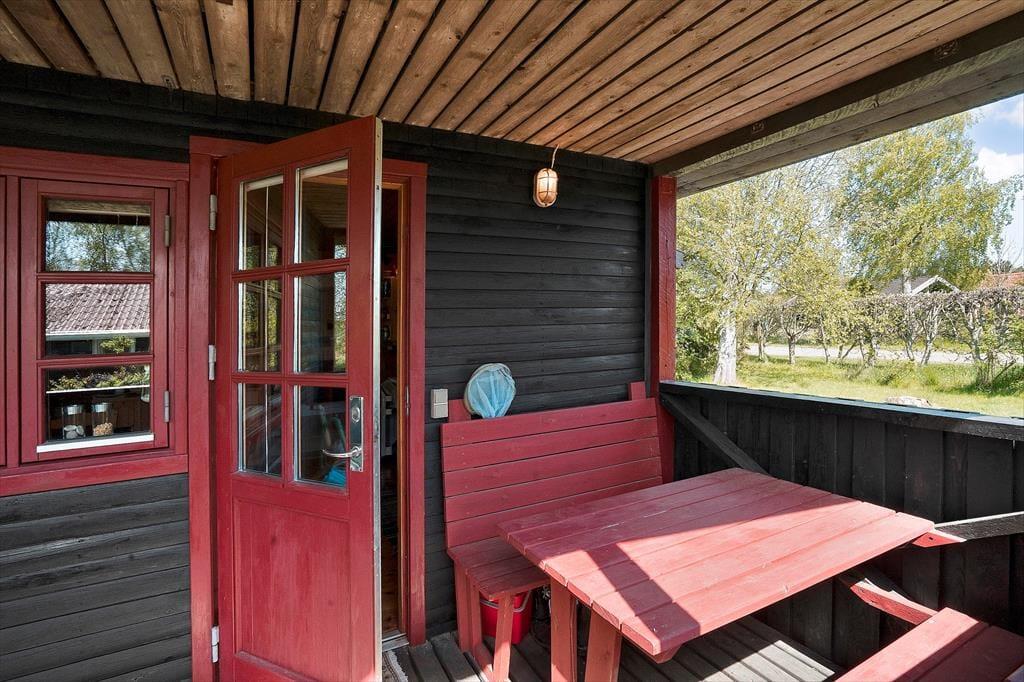 Det hyggelige køkken er i forbindelse med opholdsstuen, og i køkkenet er der alt, hvad man har brug for, når feriens måltider skal tilberedes. Her er blandt andet ovn, køleskab, kogeplader og kaffemaskine, og ligesom i resten af sommerhuset, er trævæggene og gulvene pænt bevaret. Ved køkkenet er spisebordet, hvor man kan nyde sine måltider og det gode lysindfald fra vinduerne. Fra køkkenet og spisepladsen er der en dør, som fører ud på en dejlig overdækket terrasse. Det er perfekt at tage sine måltider med ud på den sydvendte terrasse, der bliver som et ekstra rum i huset.