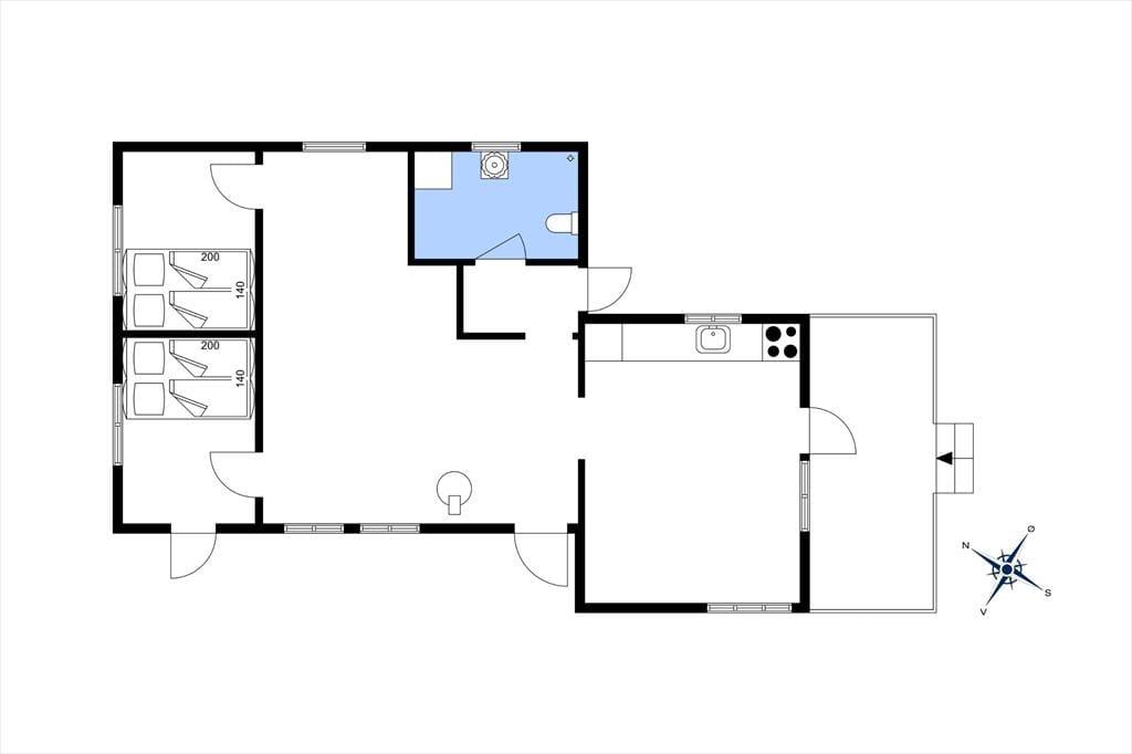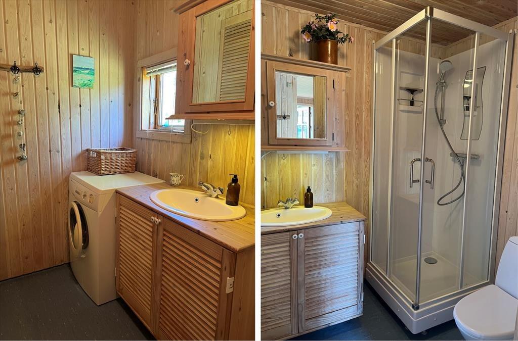 Ved siden af værelserne er der badeværelse med brusekabine. Der er trægulve i hele huset undtagen i badet. Huset varmes op af en luft til luft varmepumpe og suppleres godt af brændeovnen i kolde perioder.