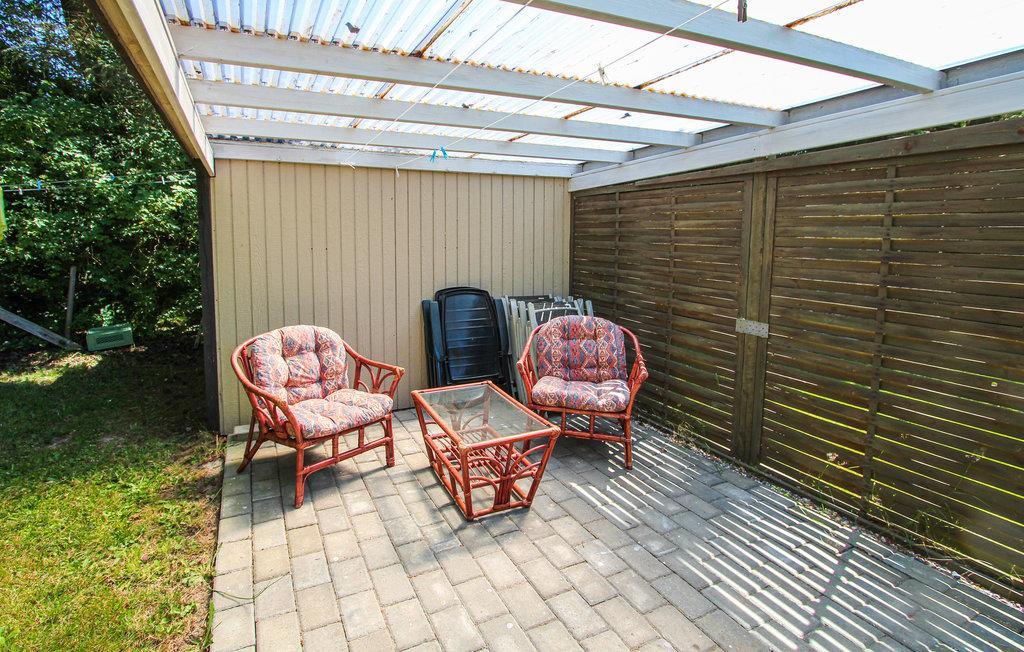 Udendørs venter en skøn, delvist overdækket terrasse og en dejlig have med flere hyggelige kroge.