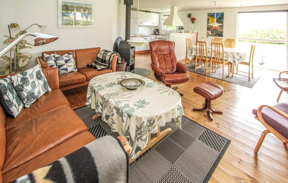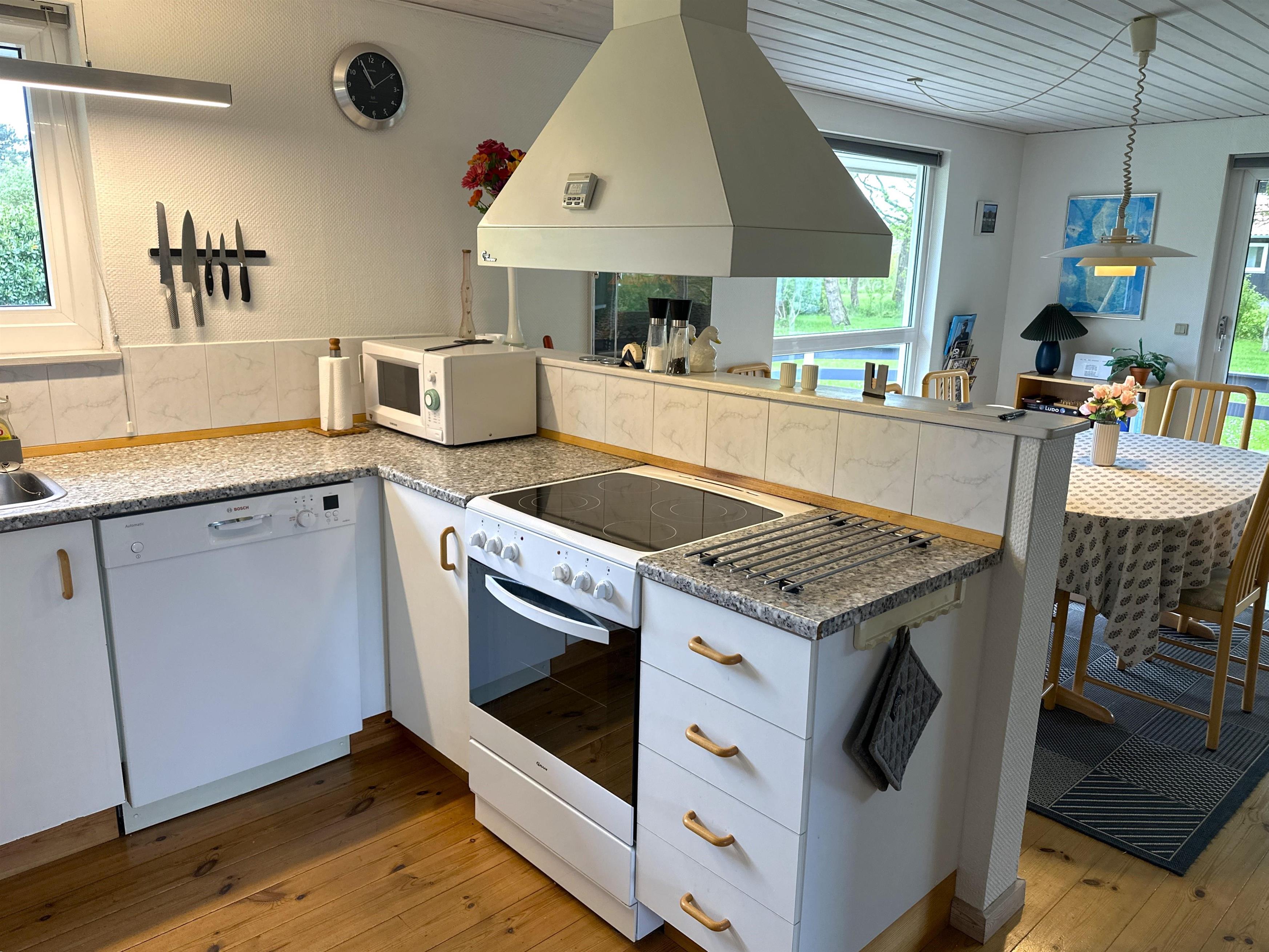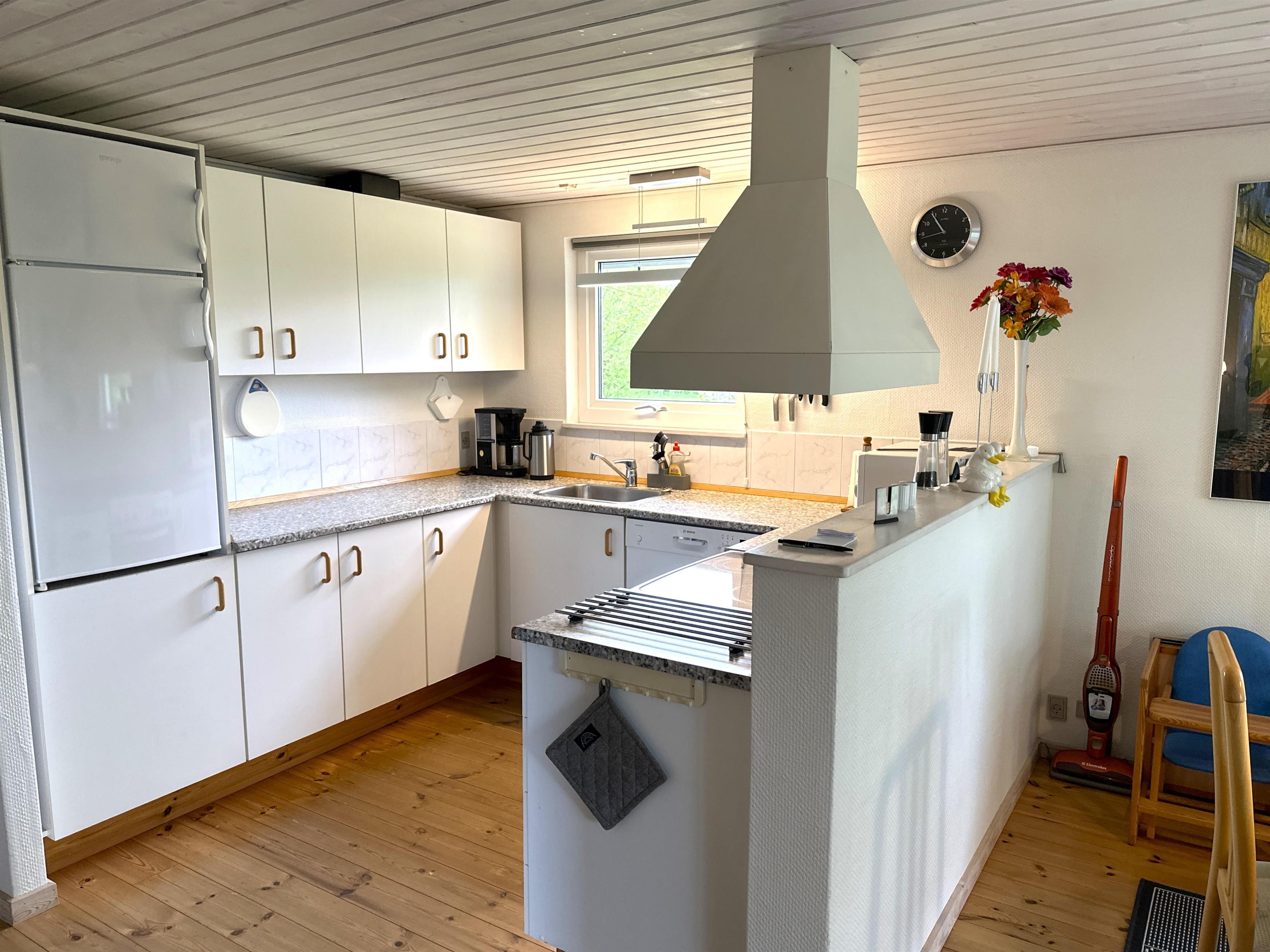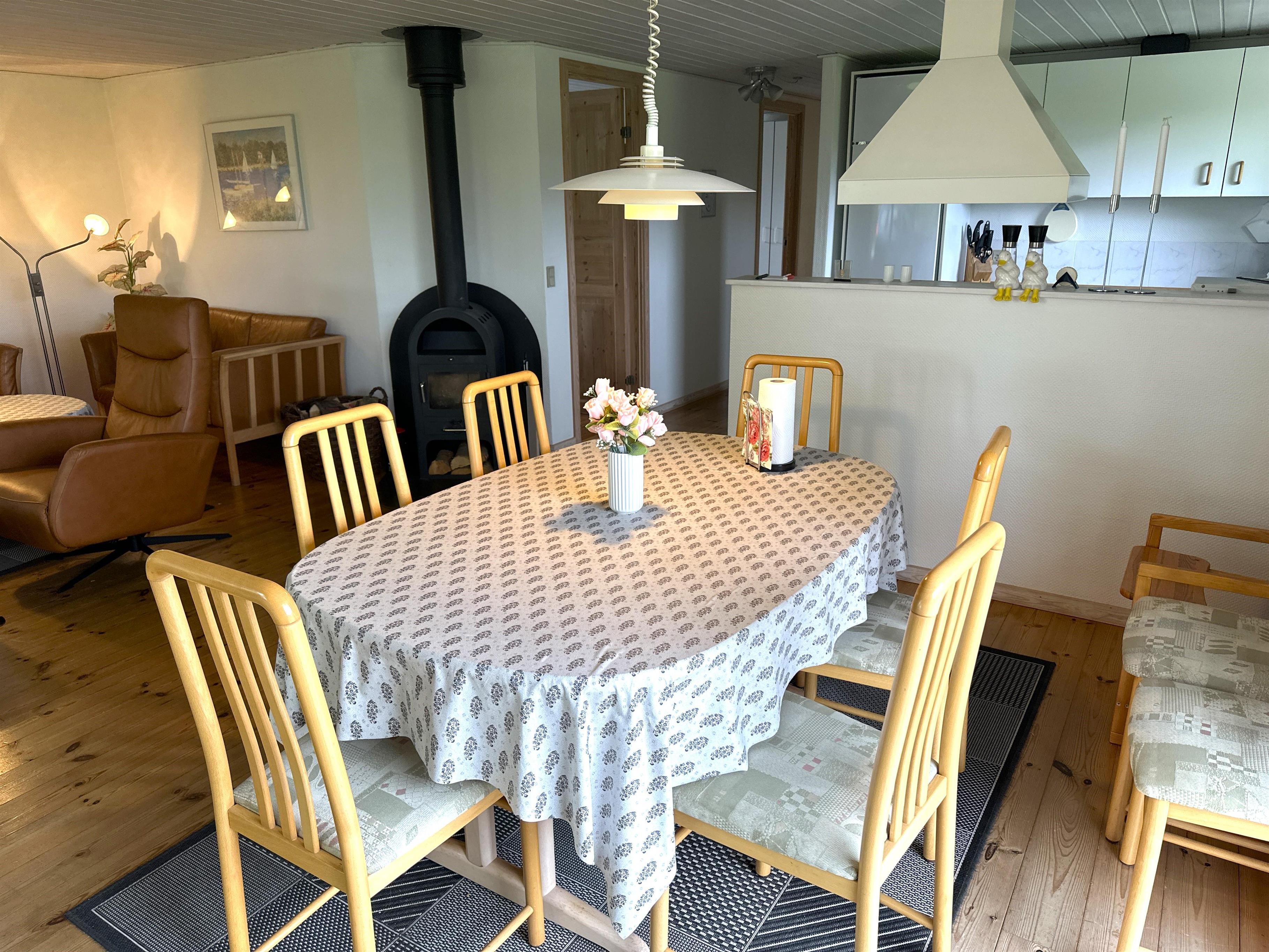 Sommerhuset har plads til op til 6 personer og er indrettet med fokus på komfort og hygge. Det store køkkenalrum byder på spiseplads og et hyggeligt sofahjørne med brændeovn, så I kan tilbringe hyggelige aftener sammen. Køkkenet er fuldt udstyret, så du nemt kan tilberede alt fra morgenmad til store familiemiddage.
