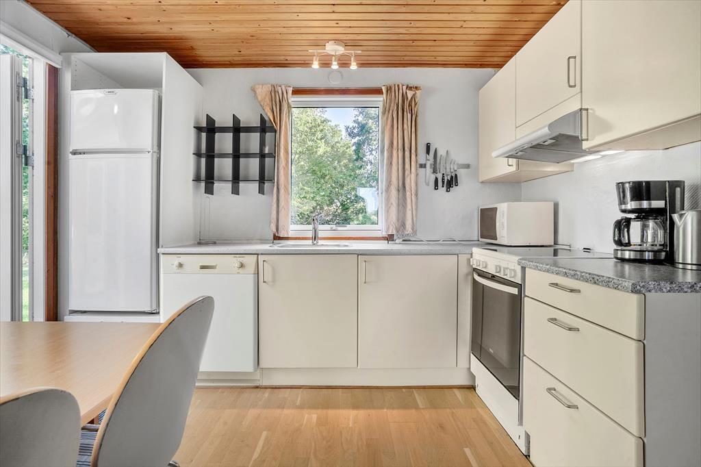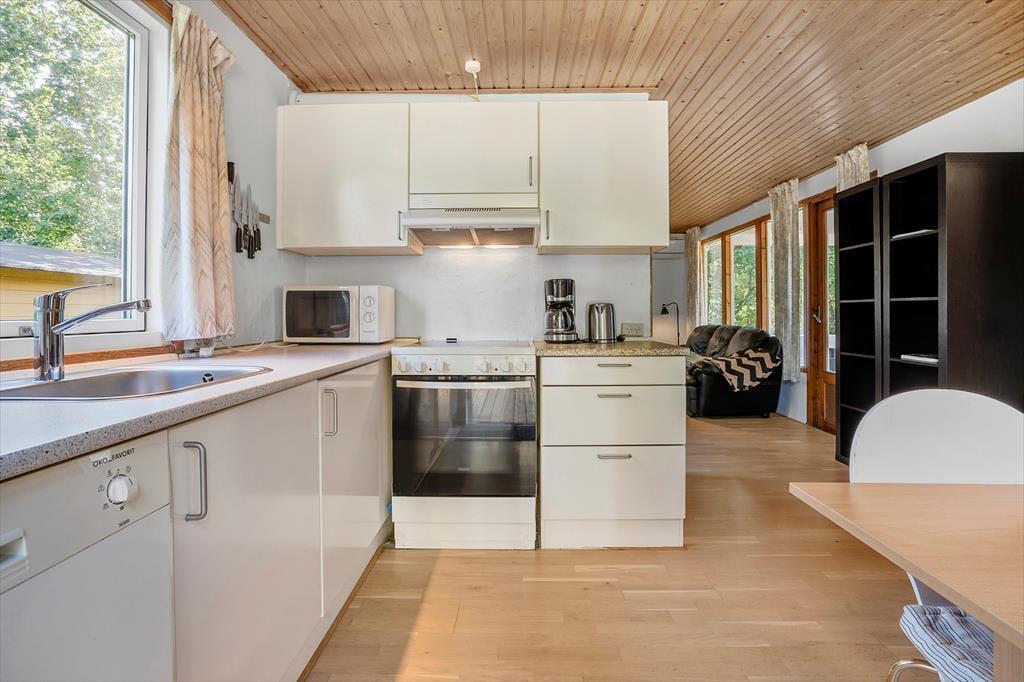 Sommerhus i Nord Samsø, Østjylland, med plads til 4 voksne. Der er en hyggelig indretning med bl.a. brændeovn, og du finder desuden vaskemaskine, opvaskemaskine og tørretumbler i boligen.