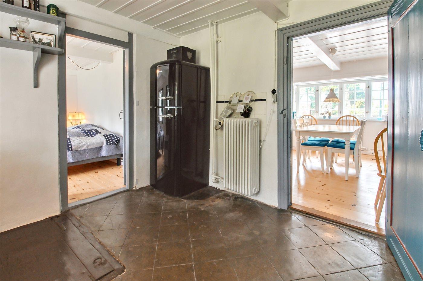 Køkkenet er udstyret med 1 køleskab. Der er 4 keramiske kogeplader, varmluftovn, mikrobølgeovn samt opvaskemaskine.
