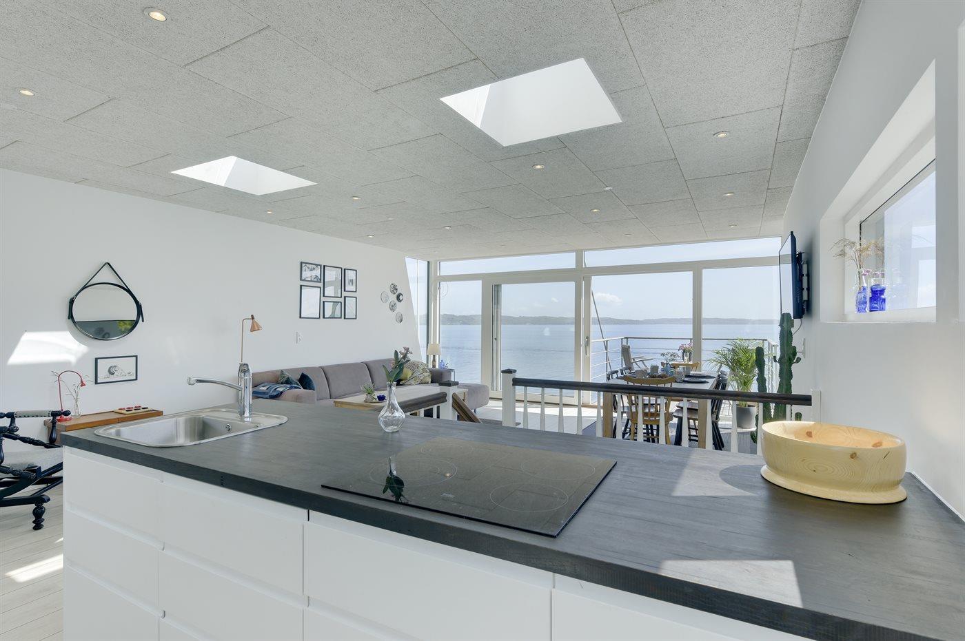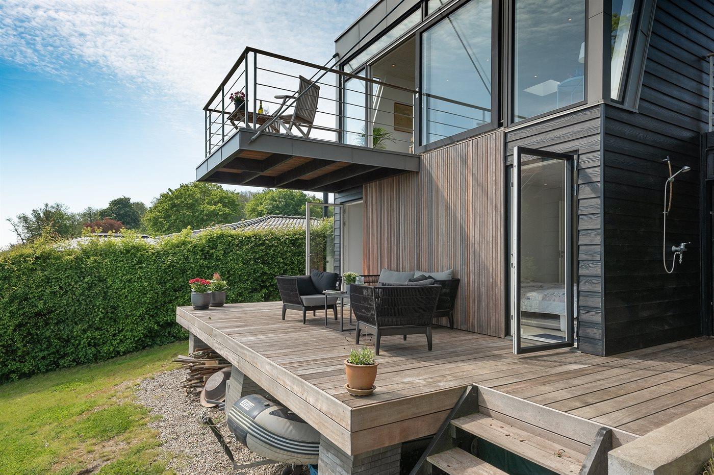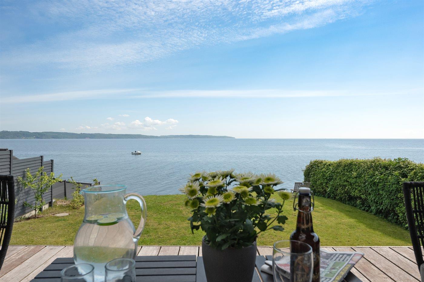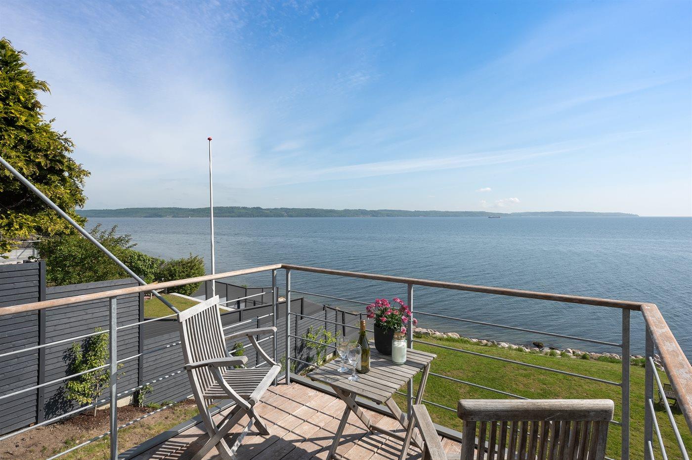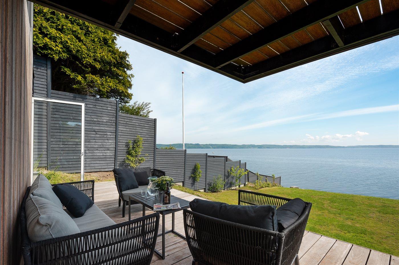 Nyd enestående panoramaudsigt over Vejle Fjord fra dette moderne sommerhus ved vandet.