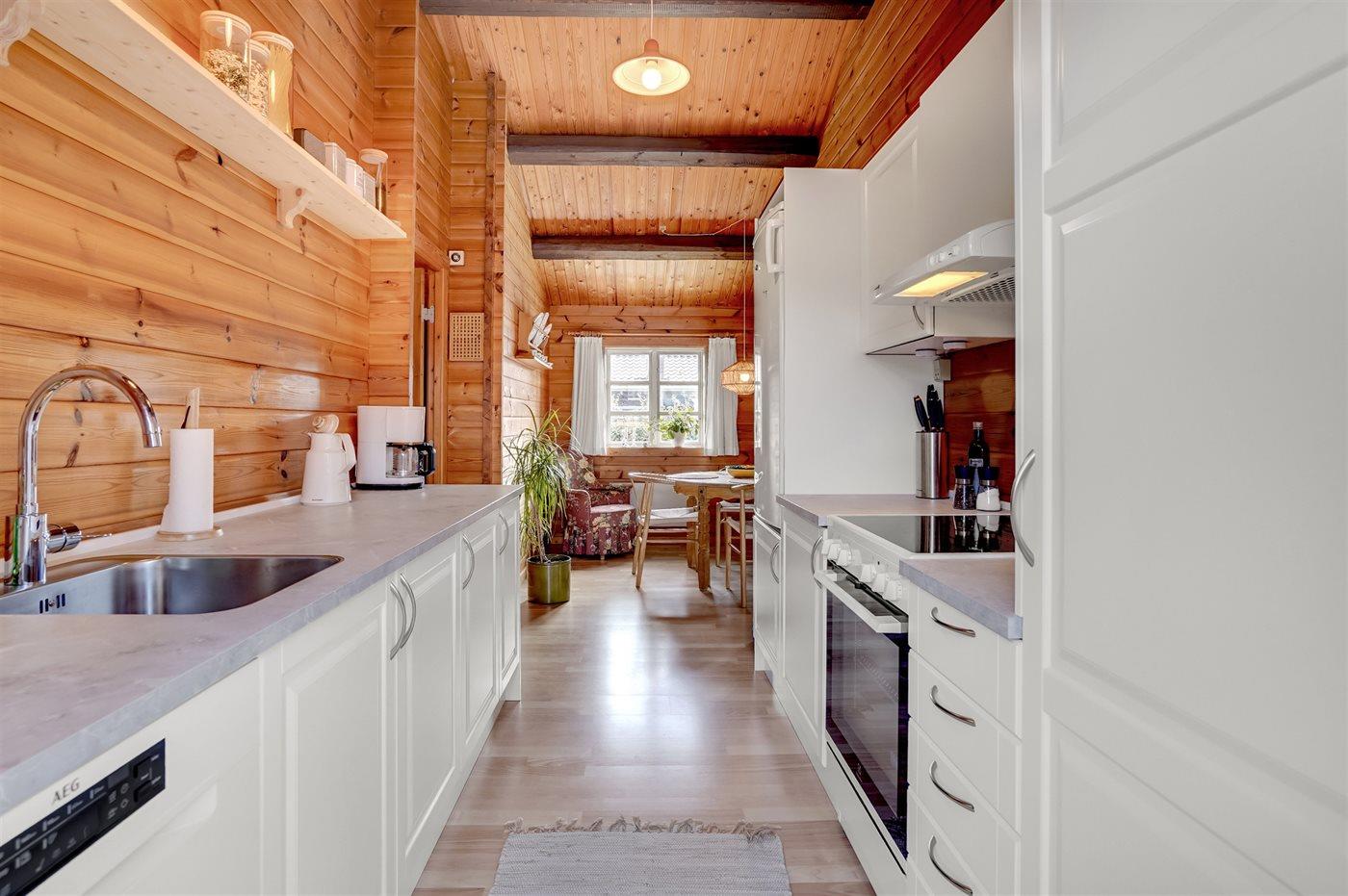 Køkkenet er udstyret med 1 køleskab. Der er 4 keramiske kogeplader, varmluftovn samt opvaskemaskine.