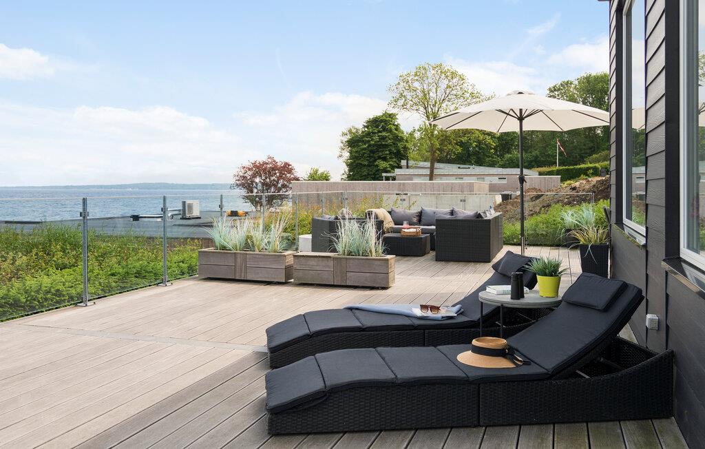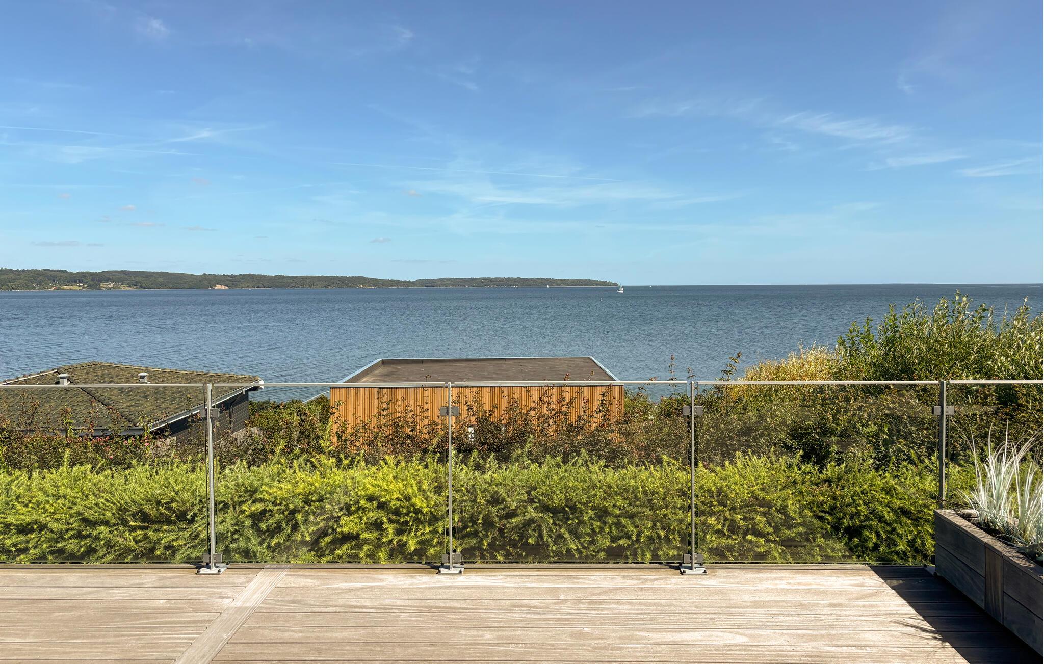 Moderne feriehus med terrasse og panoramaudsigt over Vejle Fjord nær sandstrand.
