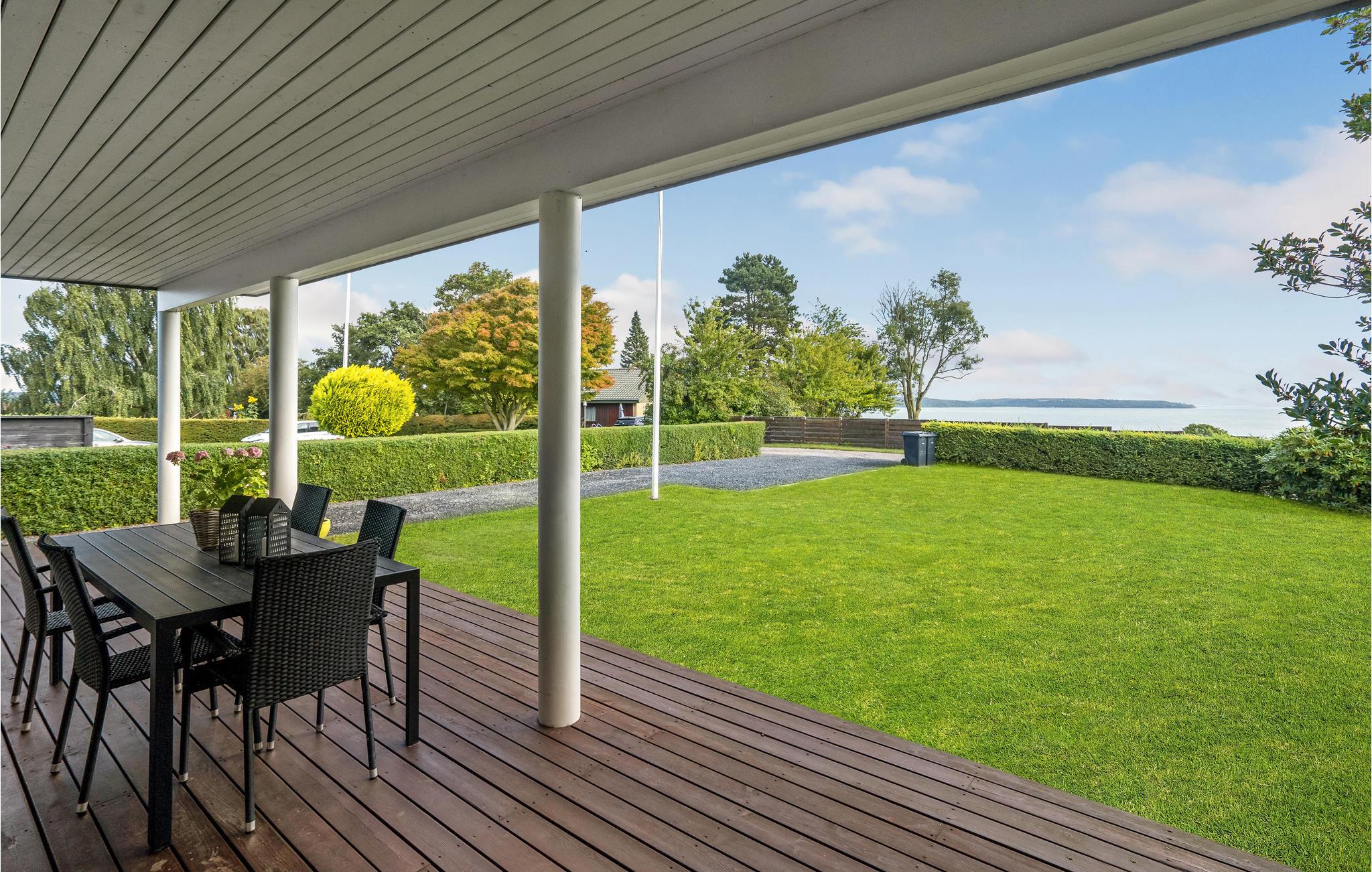 Nyd morgenkaffen med udsigt til indsejlingen til Vejle Fjord, og måske stilheden inden den øvrige familie får øjne. Lyder det som en skøn start på en dejlig feriedag? Så er det dette feriehus I skal leje. Der er en flot panoramaudsigt fra den overdækkede, store østvendte terrasse. Bag huset ligger endnu en terrasse (vestvendt). Feriehuset er indrettet med en flot, stor stue i rigtig hyggelig sommerhusstil i lyse farver, og med sofaarrangement og spiseplads. Der er naturligvis også udsigt fra stuen. Køkkenet er veludstyret og ligger i åben forbindelse med stuen. Hertil to dejlige, rummelige soveværelser samt et badeværelse med vaskemaskine.