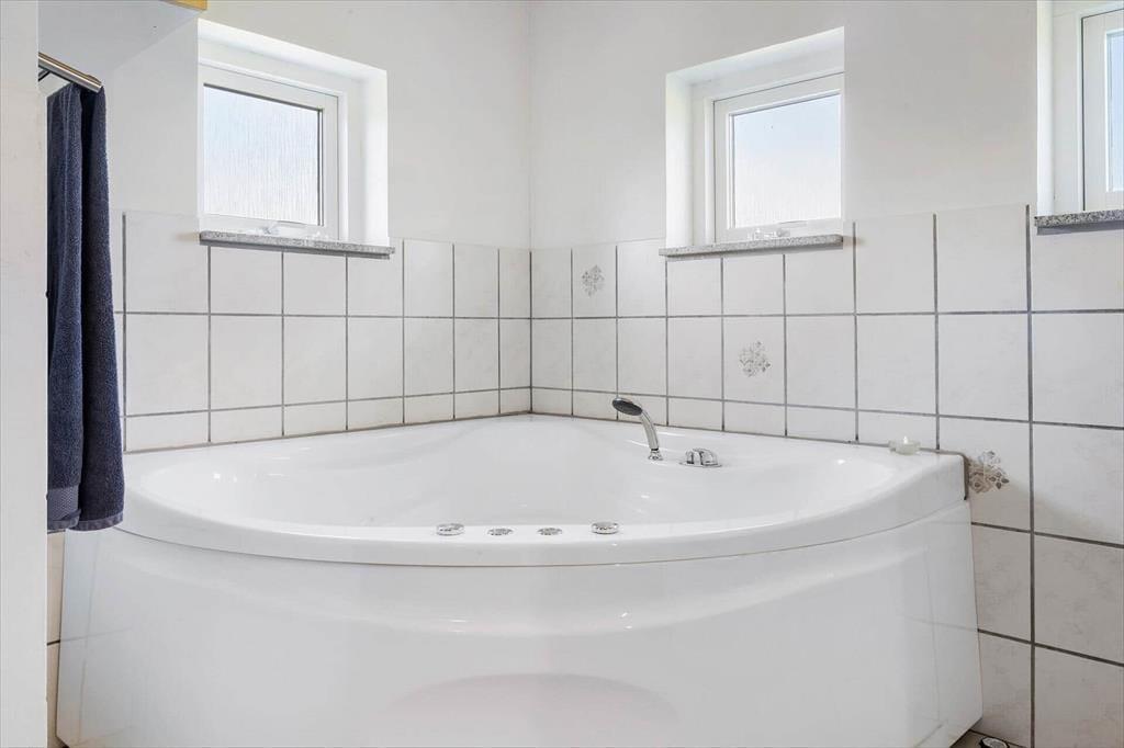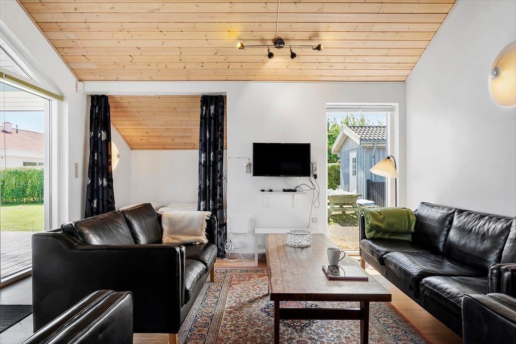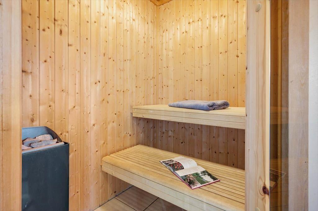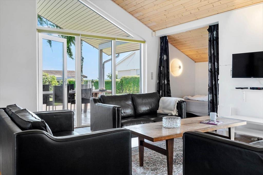 Når du træder indenfor i dette sommerhus, mødes du af en lys og indbydende atmosfære. De skrå lofter og store vinduespartier giver en fornemmelse af rummelighed og bringer masser af dagslys ind i rummene. Stuen er indrettet med komfortable møbler, og brændeovnen i hjørnet sikrer hyggelige stunder, når aftenen falder på. Køkkenet er åbent og moderne med alt, hvad du behøver for at tilberede lækre feriemåltider. Efter en dag fuld af aktiviteter kan du lade dine muskler slappe af i husets spabad eller tage en tur i saunaen for en ægte wellness-oplevelse. Huset rummer gode soveværelser, hvor du kan se frem til en god nats søvn.