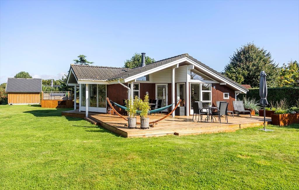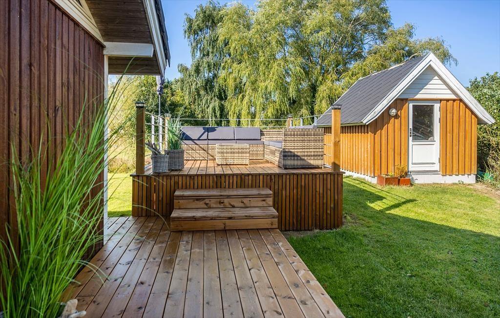 Fra stuen er der udgang til en dejlig terrasse, som delvist er overdækket. Det giver jer både mulighed for at sidde i skygge og læ – eller for at nyde de lune sommeraftener helt ude i det fri. Her kan I tænde op i grillen, spise aftensmad under åben himmel og måske endda slutte dagen af med et spil kort eller en kop kaffe fra husets espressomaskine i aftensolen. En anden mulighed er at tage plads i loungemøblerne på den forhøjede terrasse og nyde udsigten mod vandet.