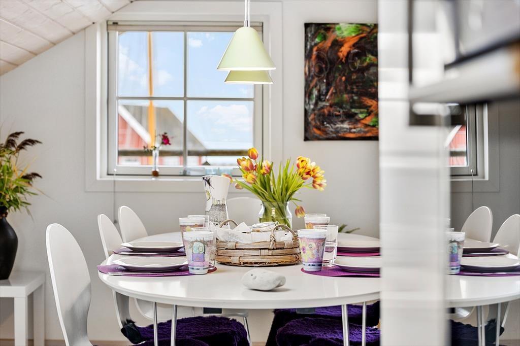 Dette rum er lyst og åbent, og samtidig er det meget hyggelige rammer at samle hele familien eller vennerne i. Den gode udsigt kan nydes gennem de store sydvendte vinduer fra både spisebordet og den hyggelige sofastue. I de komfortable sofamøbler kan I samles om et spil eller tænde for TV´et og slappe helt af. Fra stuen er der terrassedøre ud til den overdækkede altan. På den måde bliver altanen en forlængelse af stuen og det er helt perfekt tage hyggen med udenfor, hvor I kan sætte jer og nyde udsigten over hele Mårup havn og Sælvig bugten.