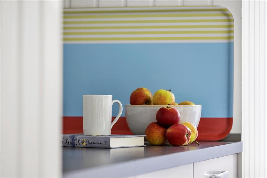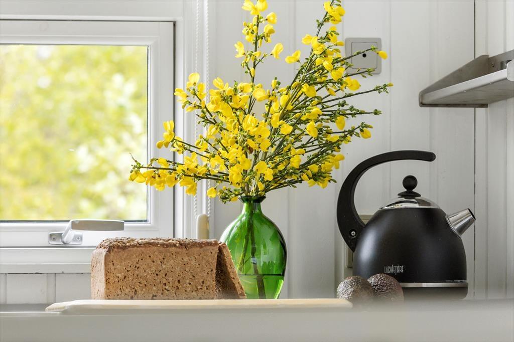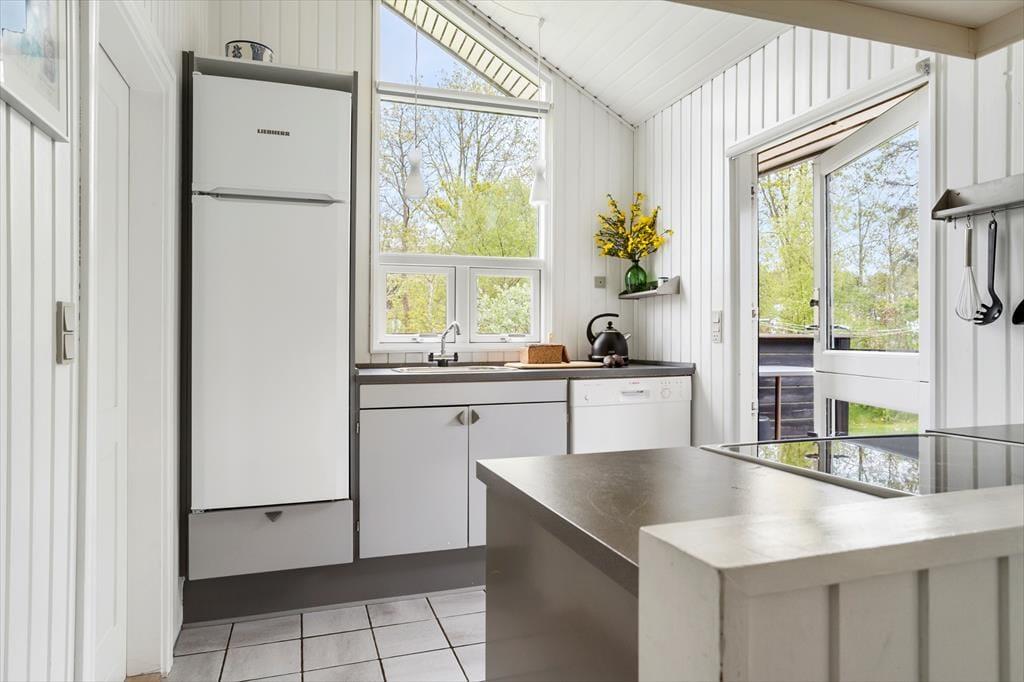 I køkkenet er der vinduer ud mod de grønne omgivelser og med kig til kysten. Her er også en havedør ud til terrassen, så når vejret tillader det, kan I let tage måltiderne med udenfor. Det åbne køkken gør, at du kan lave mad og samtidig være med i samtalerne ved spisebordet. Her er god plads til, at I alle kan sidde sammen og spise eller planlægge dagens oplevelser på Samsø.