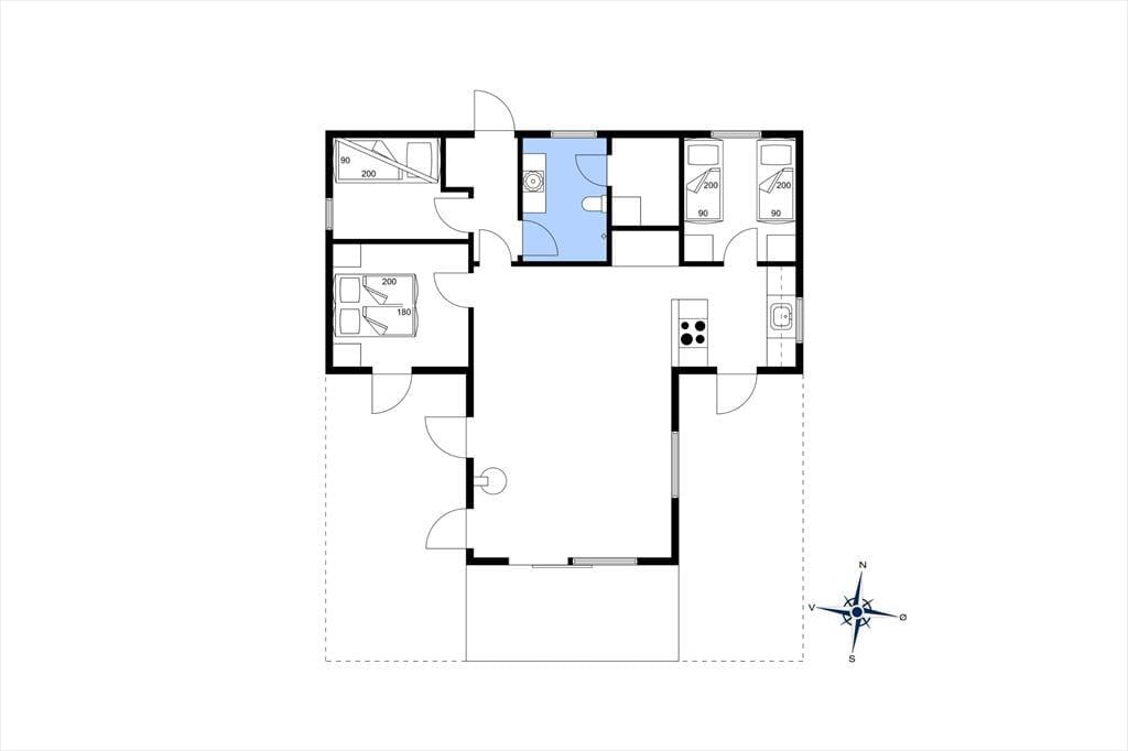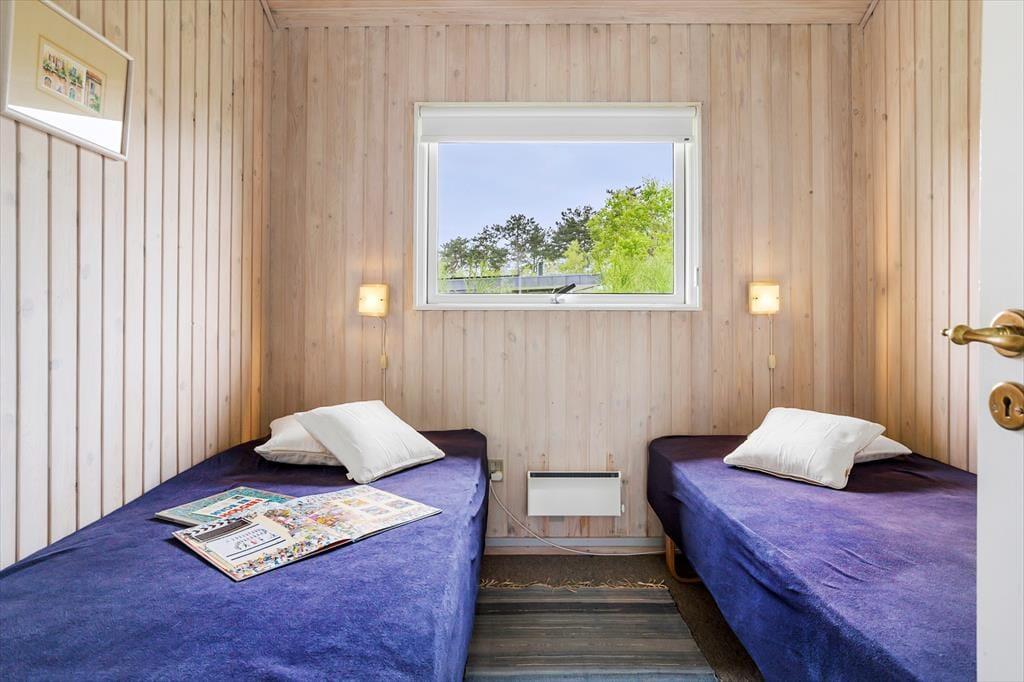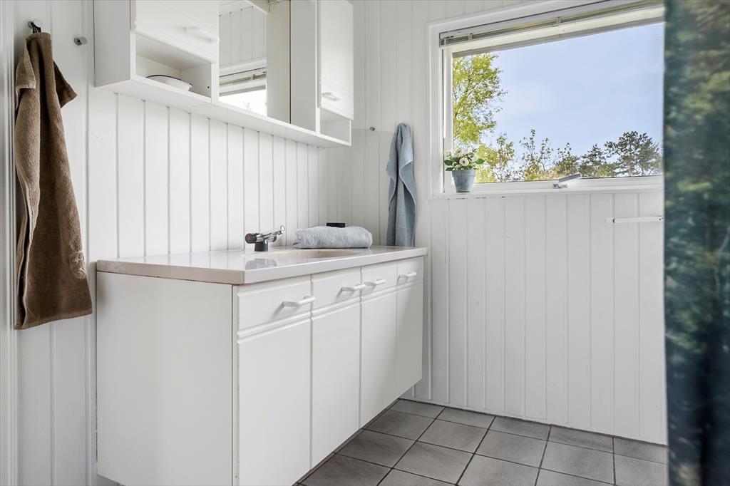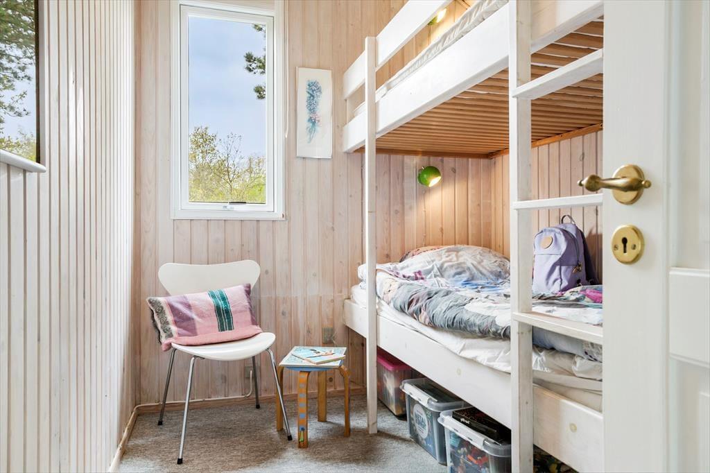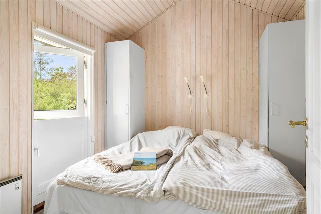 Sommerhuset har tre soveværelser, der passer perfekt til 4 voksne og 2 børn. Det ene soveværelse har en god dobbeltseng samt en havedør der fører ud på terrassen. Det andet soveværelse har to enkeltmandssenge, og det tredje værelse har en køjeseng. I alle værelser er der gode vinduer ud mod haven og skabsplads. Husets badeværelse er som resten af huset lyst og har en god størrelse, så alle faciliteter er på plads til, når I skal på ferie i dette sommerhus helt tæt på naturen og stranden.