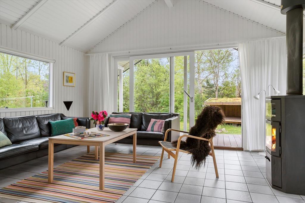 I sofahjørnet er der store vinduer, som giver masser af lys og kig ud på de grønne omgivelser. Fra stuen/alrummet er der endnu en havedør, så det er muligt at gå direkte ud på endnu en dejlig terrasse.