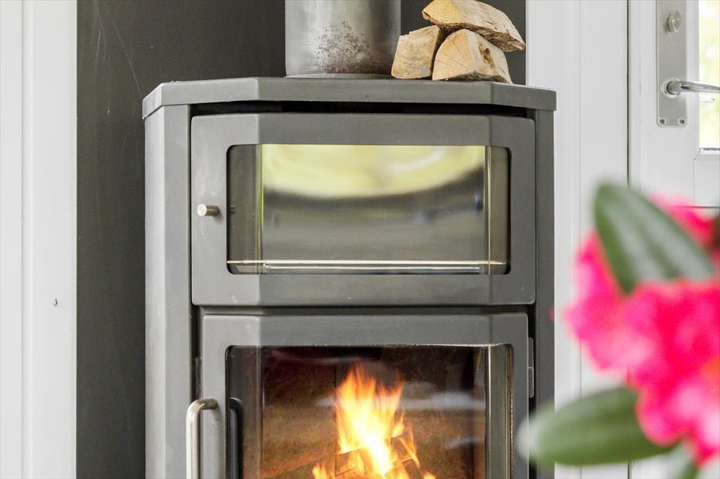 I forlængelse af spisebordspladsen er stuen og sofa, hvor I kan slappe helt af med et spil eller tænde for TV´et. Du kan også tænde op i brændeovnen, der er centralt placeret i husets samlingsrum.