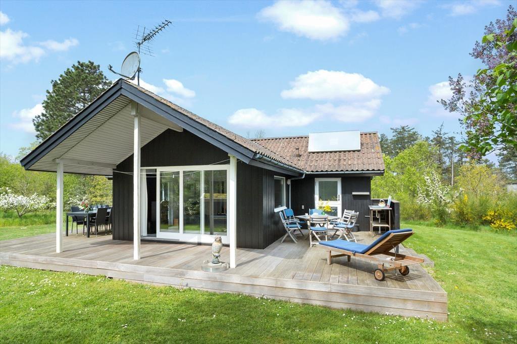 Omkring huset er en træterrasse, hvor der er udgang til både fra køkkenet, stuen og et soveværelse.