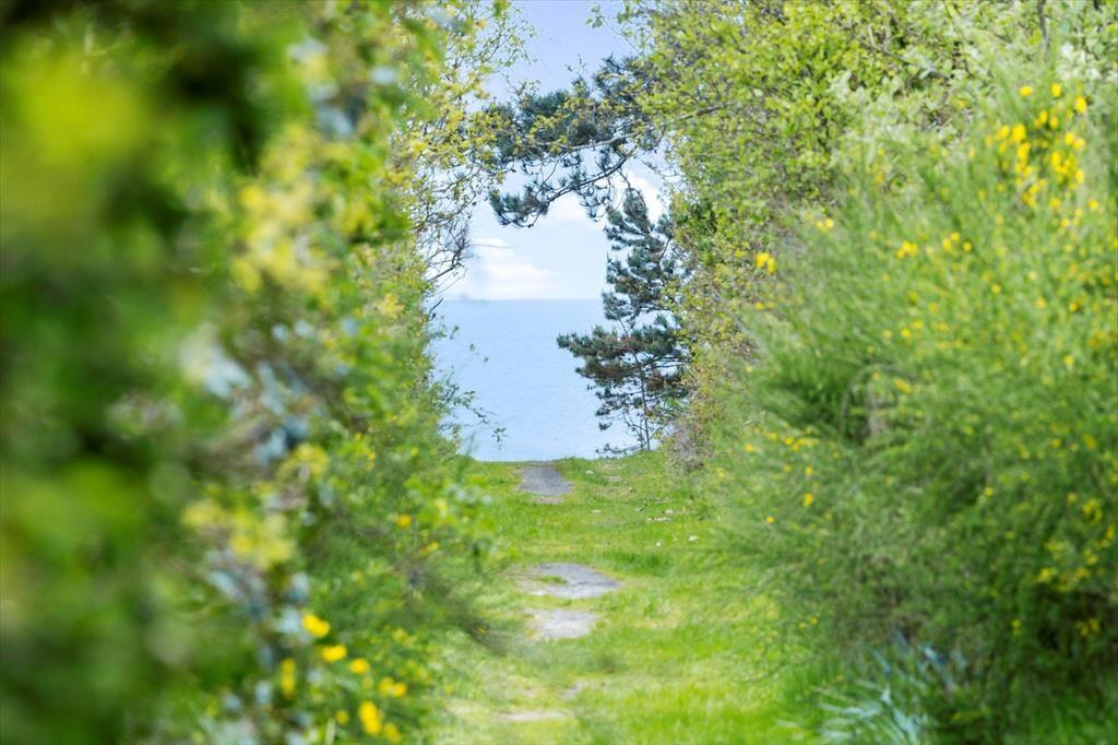 Huset er i første række til stranden, men trukket lidt tilbage bag træer og buske. En lille sti fører direkte ned til stranden, så du kan hurtigt gå ned og tage en dukkert eller gå gode ture langs kysten.