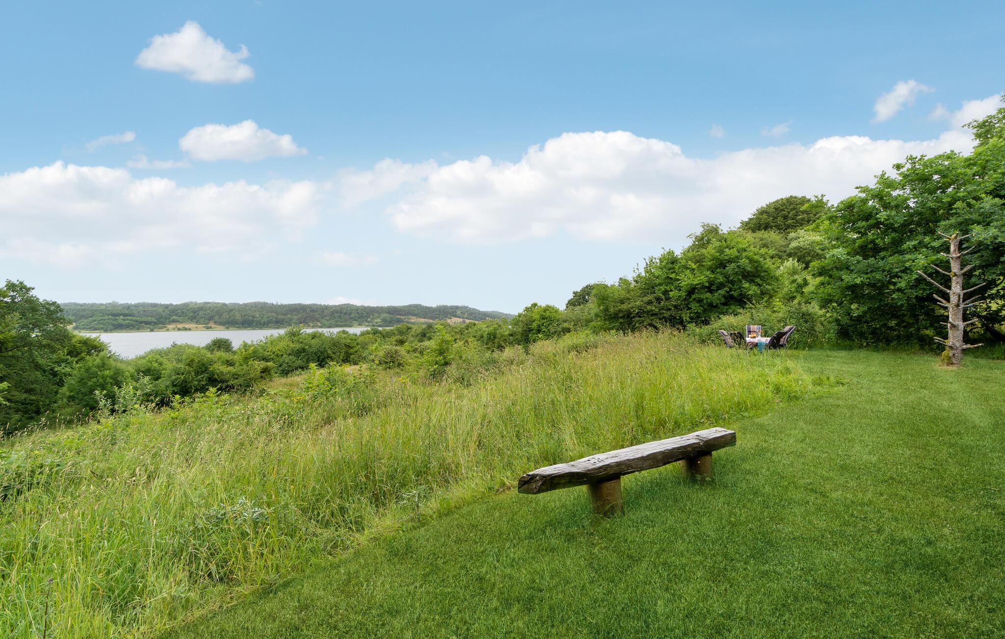 Charmerende bjælkehytte med udsigt over Mariager Fjord.