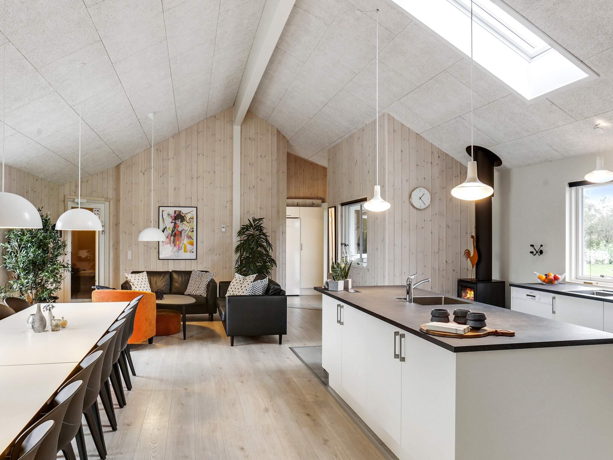Sommerhuset har et stort aktivitetsrum med billard, bordtennis, dart og fodboldspil, så alle kan dyste i turneringer. I sofahjørnet kan I følge kampene, se en god film eller spille PlayStation4. Og ved baren kan I snuppe jer en kølig drik. Sommerhusets store køkken har dobbelt op på udstyr: to ovne, komfurer, håndvaske, opvaskemaskiner og køleskabsplads, så madlavningen og den efterfølgende oprydning kan klares i fællesskab. Køkkenet ligger i forbindelse med stuen, og alle mand kan samles rundt om det lange spisebord hvor der er spiseplads til 22 personer, eller hygge sig i sofaen foran fjernsynet. I køkken-alrummet finder I sommerhusets brændeovn, der luner på en kølig aften med regn og rusk.