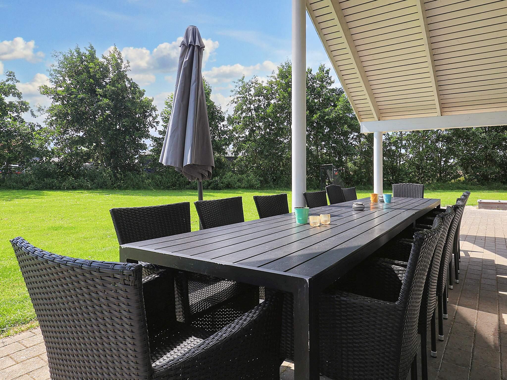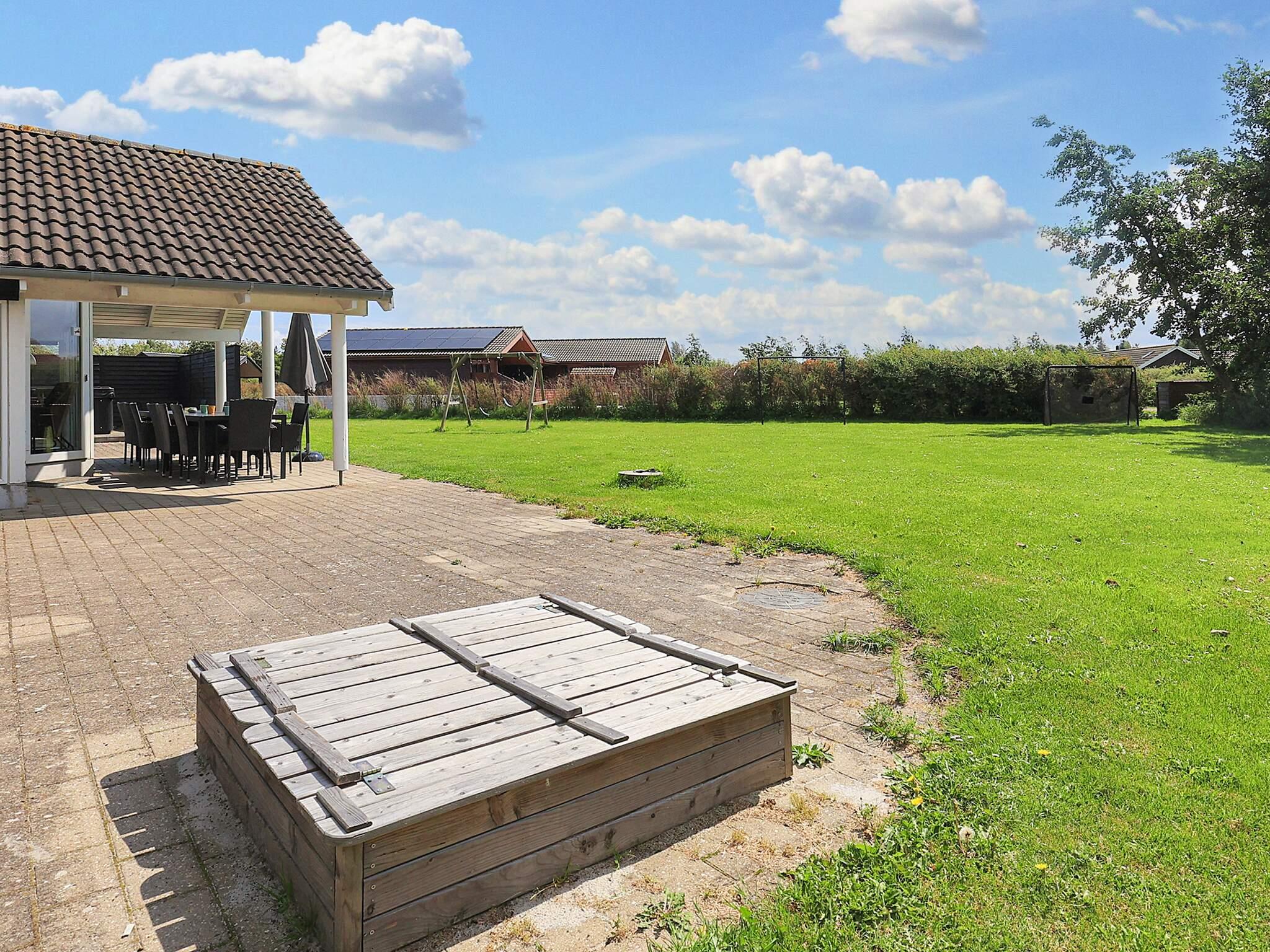 På den store grund, der omkranser huset, er der også tænkt på de mindste gæster med sandkasse og gynger. De voksne kan slænge sig på en solvogn på terrassen eller nyde spabadet.