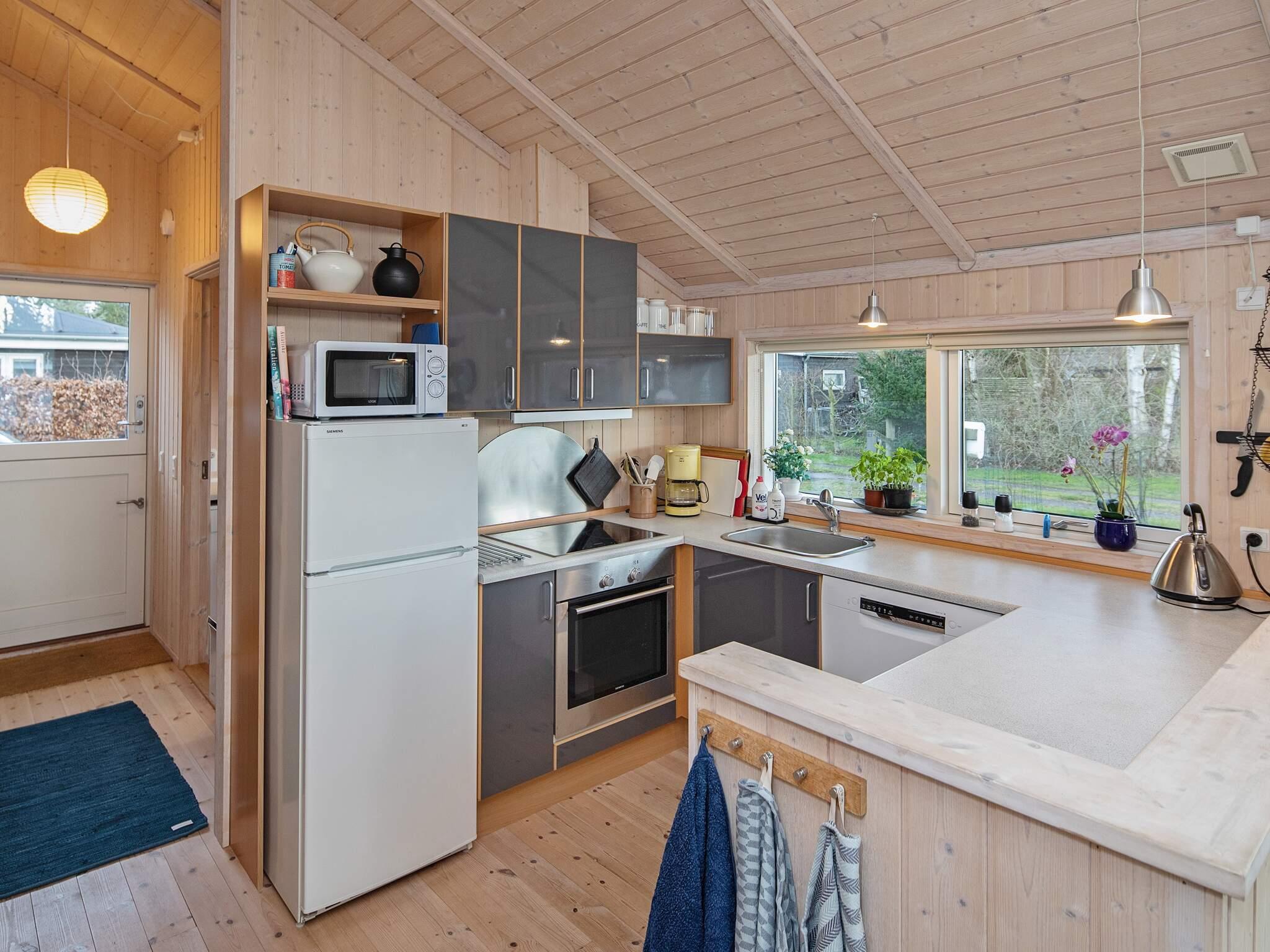 Interiøret er lyst og indbydende med et åbent køkken og opholdsstue ideel til familielivet. Køkkenet er veludstyret med keramisk kogeplade, køle-fryseskab, opvaskemaskine og alt nødvendigt for nem tilberedning af måltider. Der er to soveværelser: et med dobbeltseng og et med to enkeltsenge. Familier med små børn vil sætte pris på den medfølgende rejseseng og høj stol. Badeværelset har bruser, toilet og gulvvarme for ekstra komfort.