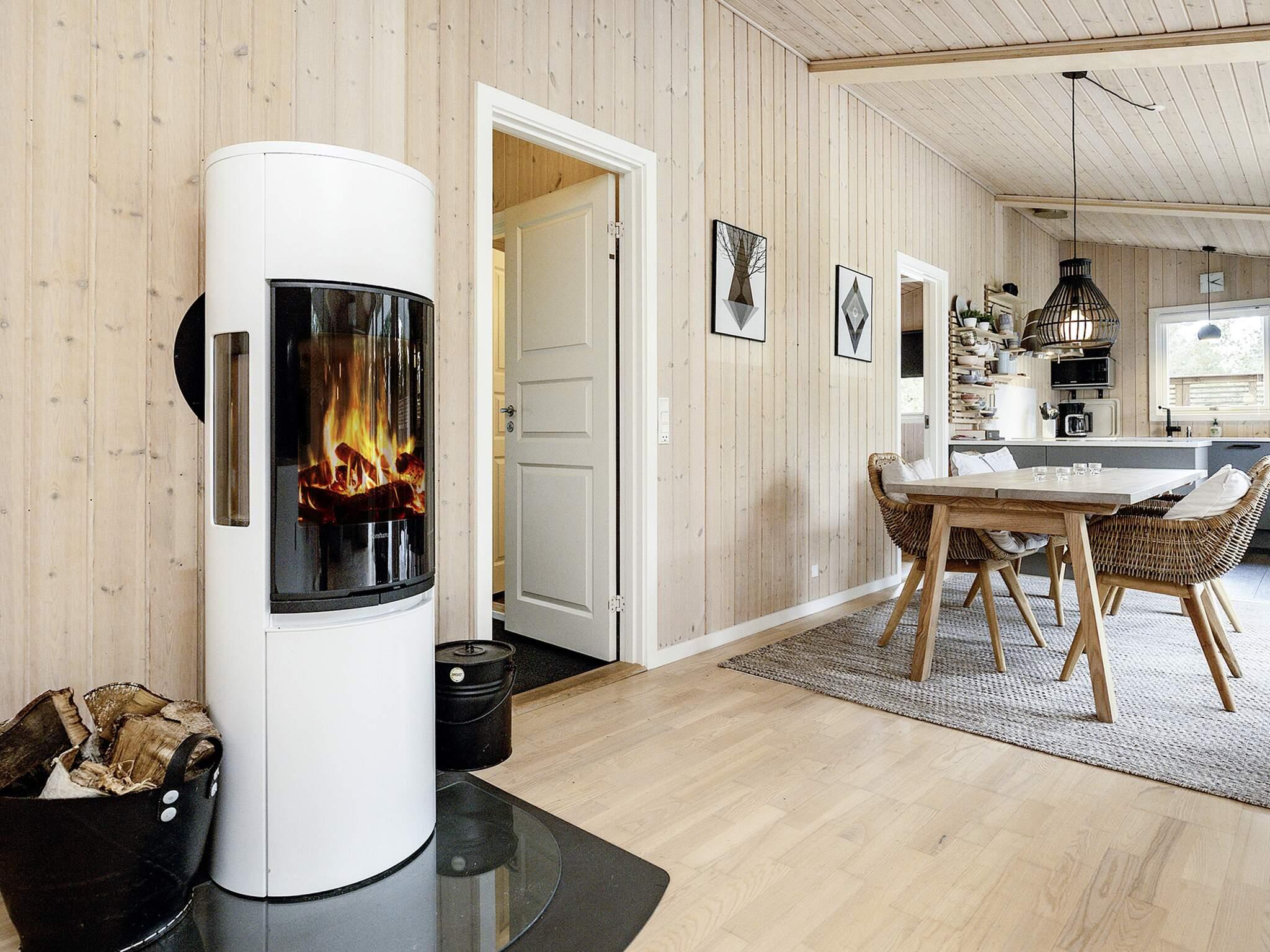 Indenfor kombinerer den lyse opholdsstue komfort og stil med en brændeovn og en klimavenlig varmepumpe for at skabe en varm og indbydende atmosfære året rundt. Det åbne køkkenhjørne er fuldt udstyret med induktionskomfur, ovn, køle-fryseskab og opvaskemaskine, hvilket gør madlavning let og behageligt for familie eller venner.