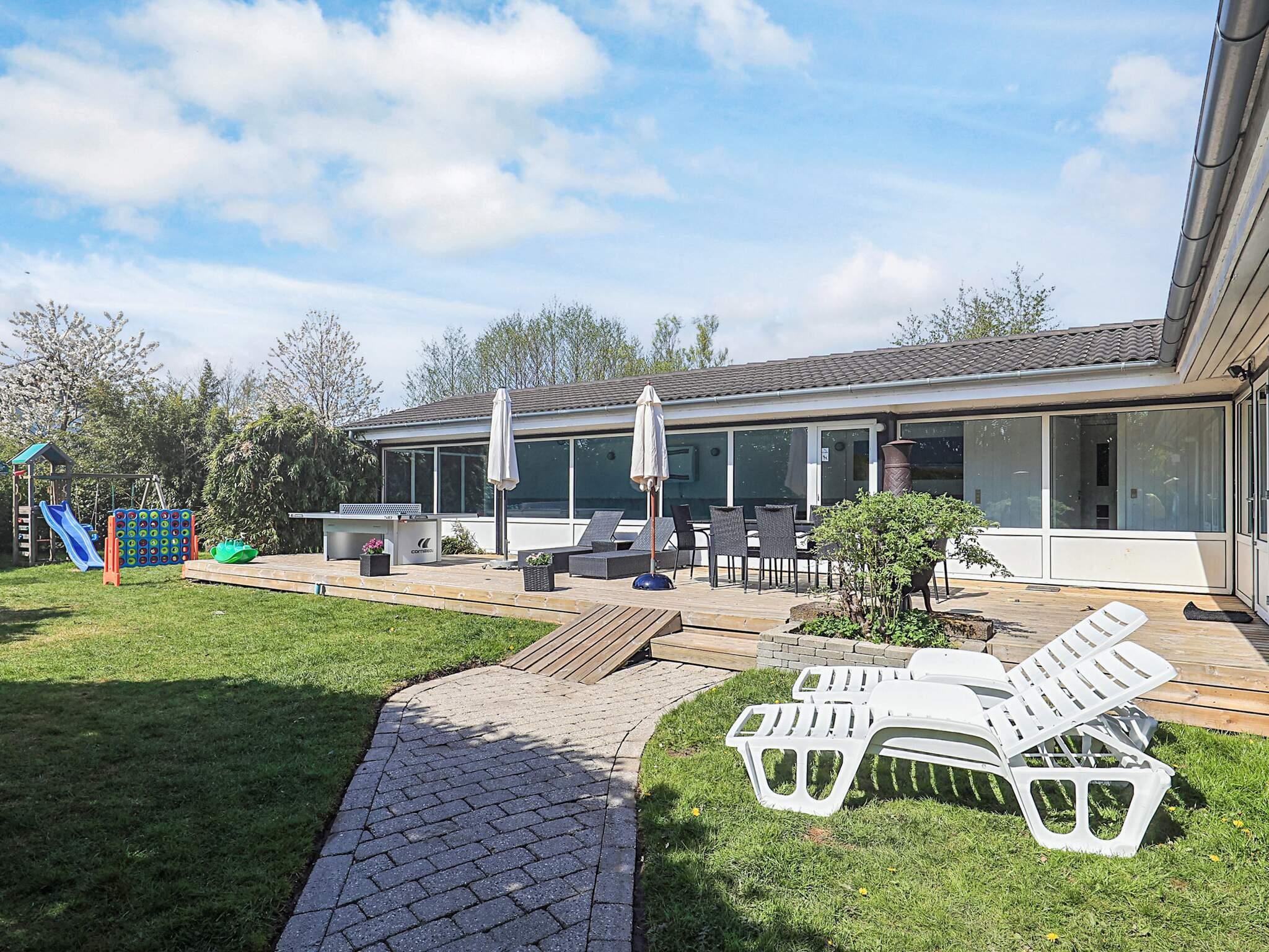 På den store grund findes der bålplads, petanquebane, trampolin, legetårn med rutsjebane og legehus samt basketballkurv (egen bold medbringes) samt bordtennisbord. I haven er der en stor træterrasse med havemøbler, liggestole, udendørs pejs og kulgrill. Udlejes ikke til ungdomsgrupper.