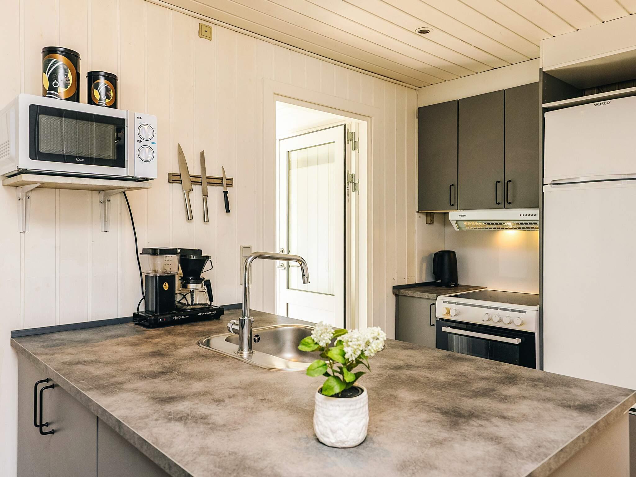 Husets køkken, som bl.a. indeholder kaffemaskine, elkomfur med ovn, mikroovn, køleskab m/frostboks samt opvaskemaskine, er renoveret i 2024. Fra det åbne køkken går I direkte ind i spiseområdet samt opholdsstue med brændeovn og varmepumpe samt tv med Chromecast, dvd-afspiller og trådløst internet.