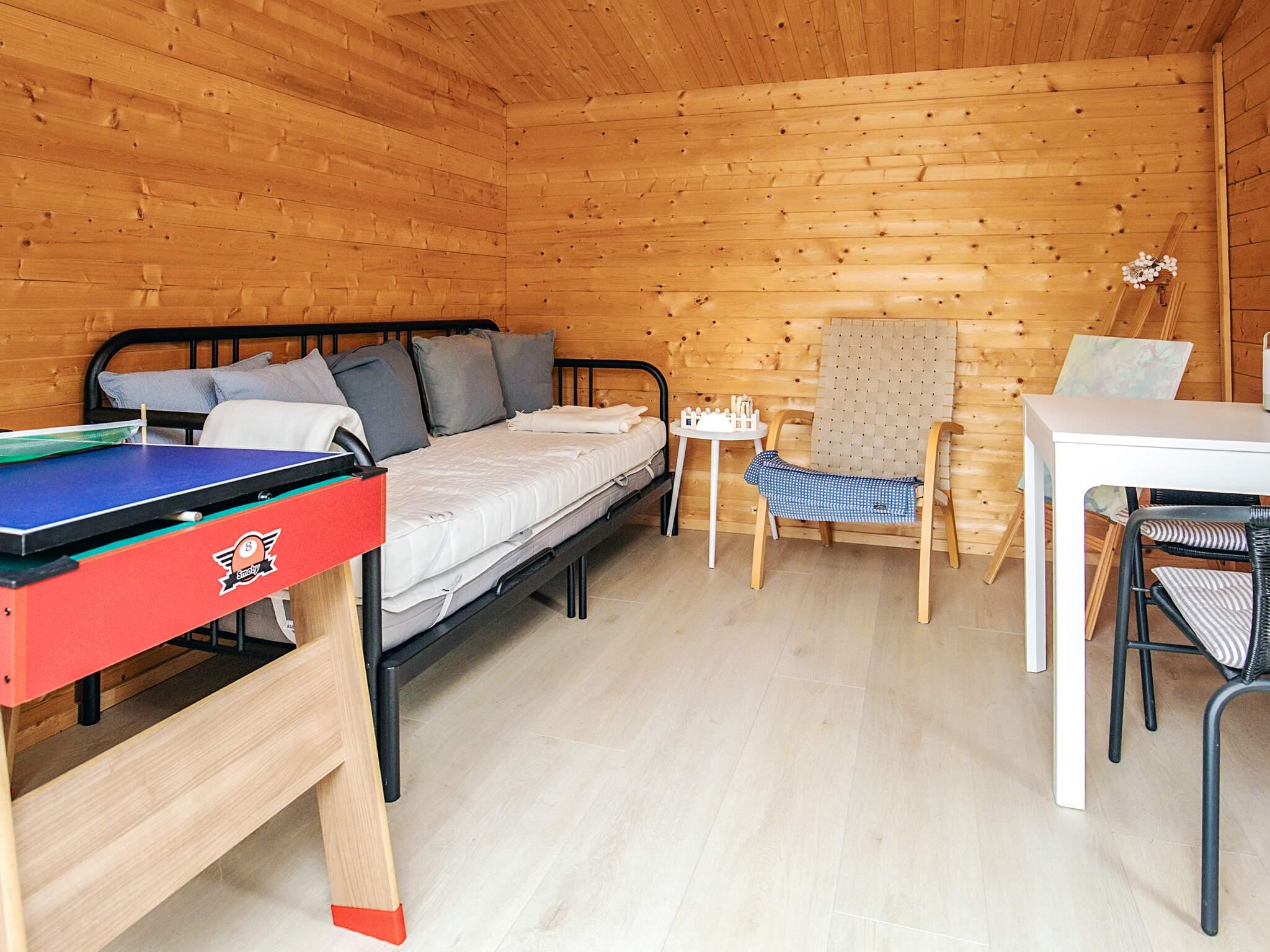 Sommerhuset er indrettet med fire soveværelser hvoraf tre af dem med dobbeltseng og et værelse med køjesenge med plads til tre personer. Der er to badeværelser med toilet, bruser,håndvask samt gulvvarme, på det ene er der desuden vaskemaskine og tørretumbler.
