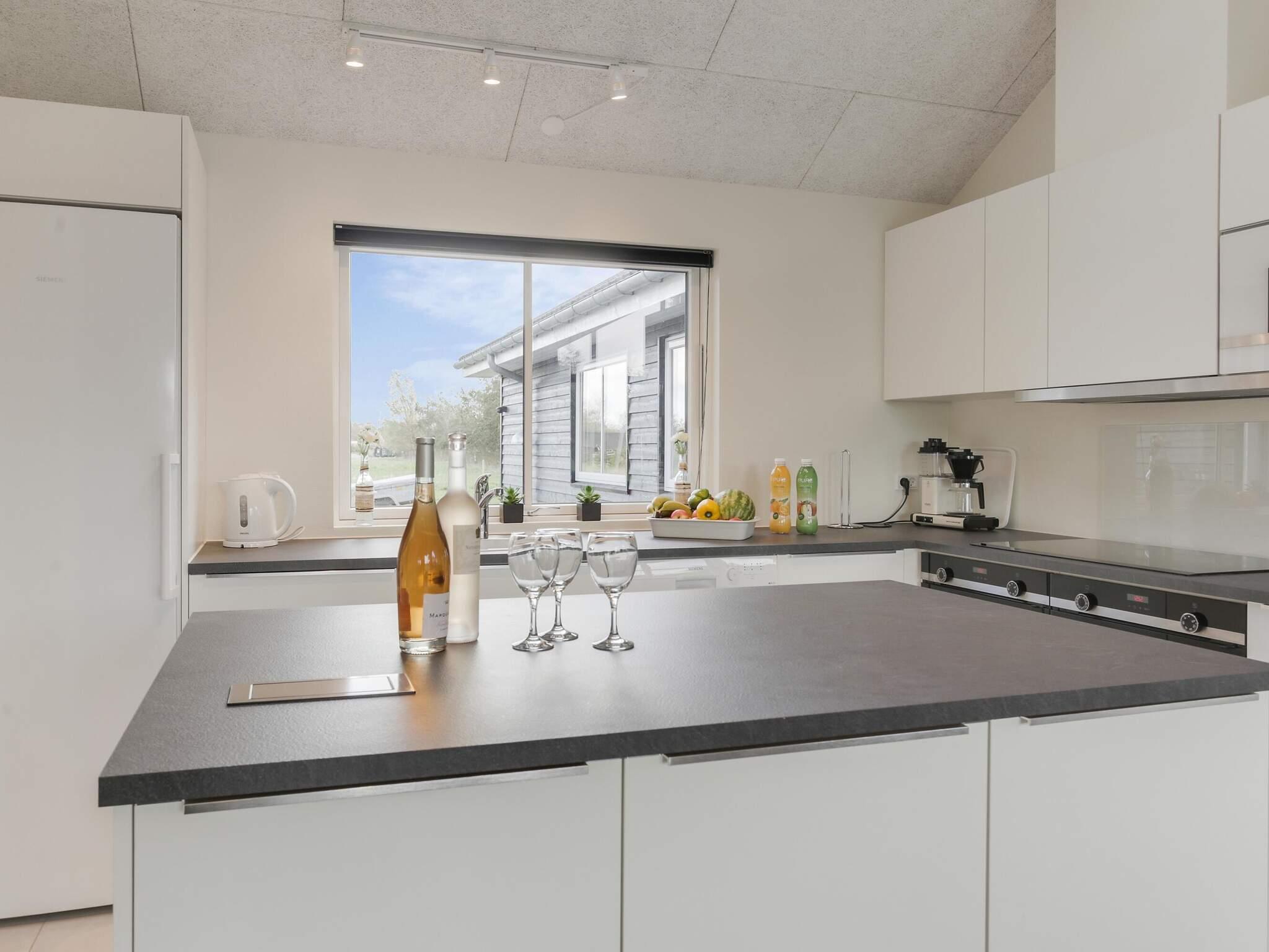 Køkken-alrummet er hyggeligt, men alligevel lyst og indbydende med ovenlys og store vinduespartier. Køkkenet har to ovne, en opvaskemaskine og et køleskab, så der er god plads til al din lækre mad. Det lange spisebord har udsigt til poolområdet, så køkken-alrummet forbinder sommerhuset og giver jer mulighed for alle at være sammen, selvom I laver forskellige ting. I alt har poolhuset tre badeværelser.