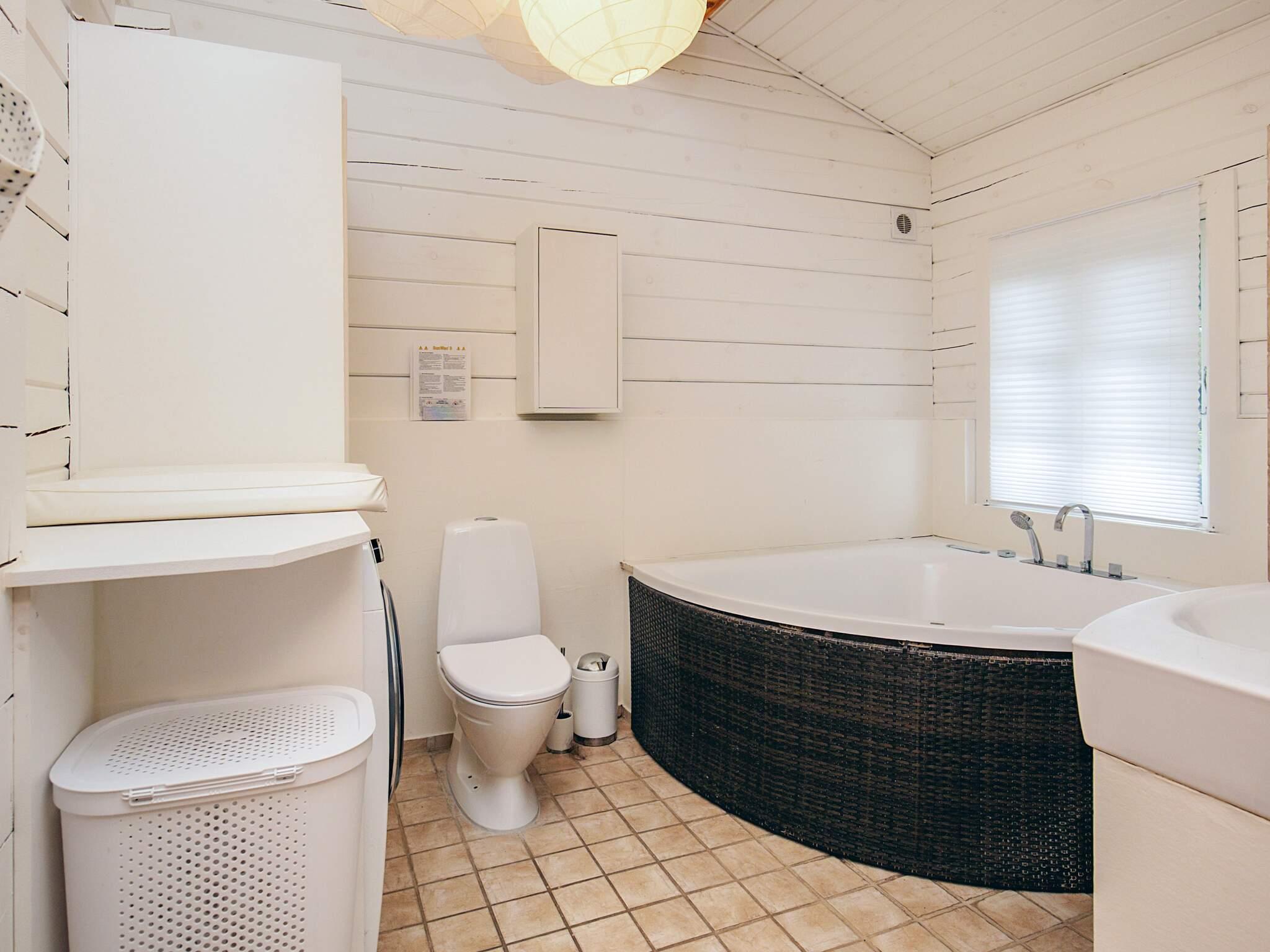 Charmerende og moderne feriehus - tæt på strand og aktiviteter Indendørs Velkommen til et lyst og indbydende sommerhus, bygget i træ med fokus på kvalitet og komfort. Huset har praktisk entré og gang, der fører til tre rummelige og smagfuldt indrettede soveværelser og to skønne badeværelser - hvoraf det ene har vaskemaskine og tørretumbler. Der er også adgang til en hyggelig hems med fire ekstra senge – et hit hos ungerne!