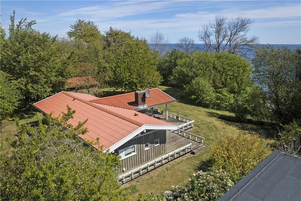 Fra stuen er der også udgang til den, delvist, overdækkede terrasse, samt haven som fører direkte ned til stranden.