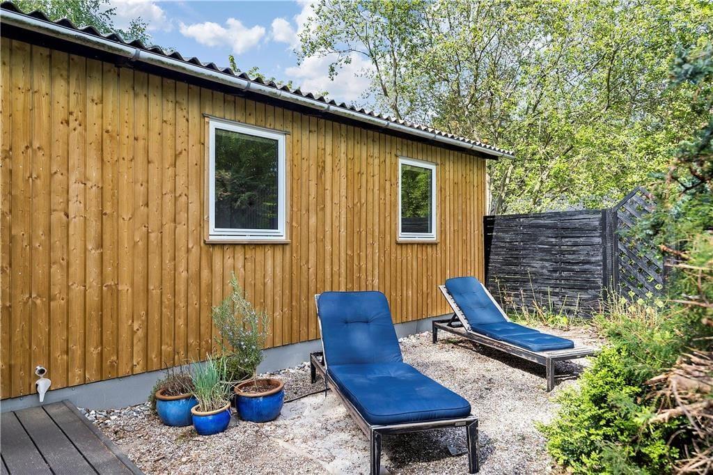 Sommerhuset er beliggende på en stor og lukket grund, med udsigt ud over åbne marker fra baghaven af. Haven har en stor græsplæne som kan bruges til diverse aktiviteter, samt gyngestativ. Haven er lukket, så man kan nyde privatlivet i ro og fred.