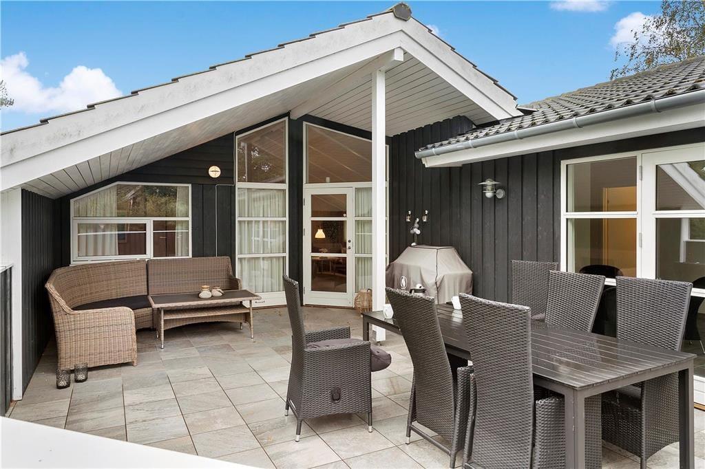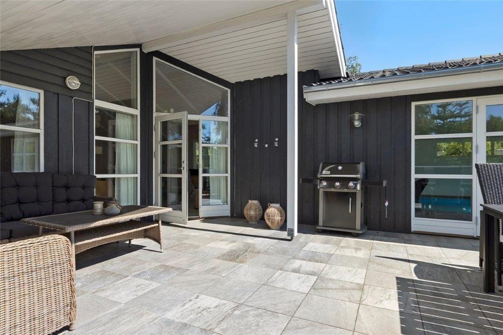 Både fra stuen og pool-området er der direkte udgang til den dejlige fliseterrasse hvor solen står på dagen lang. I haven findes også en god græsplæne som er helt perfekt til boldspil og leg for både store og små.