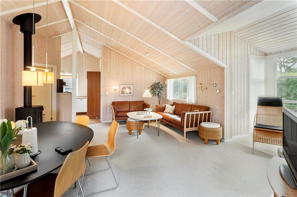 Indgang til en lille entré, hvorfra der er adgang til køkkenet, samt videre gang til den dejlige stue. Stuen byder på en sofaafdeling, en spiseafdeling og en god brændeovn i midten.