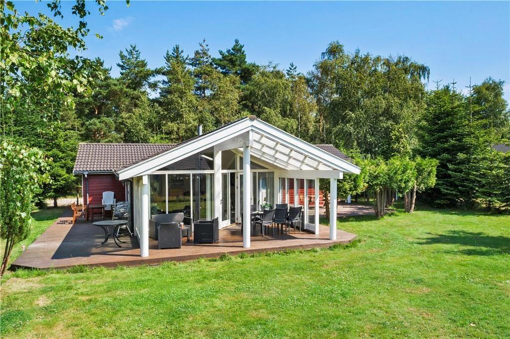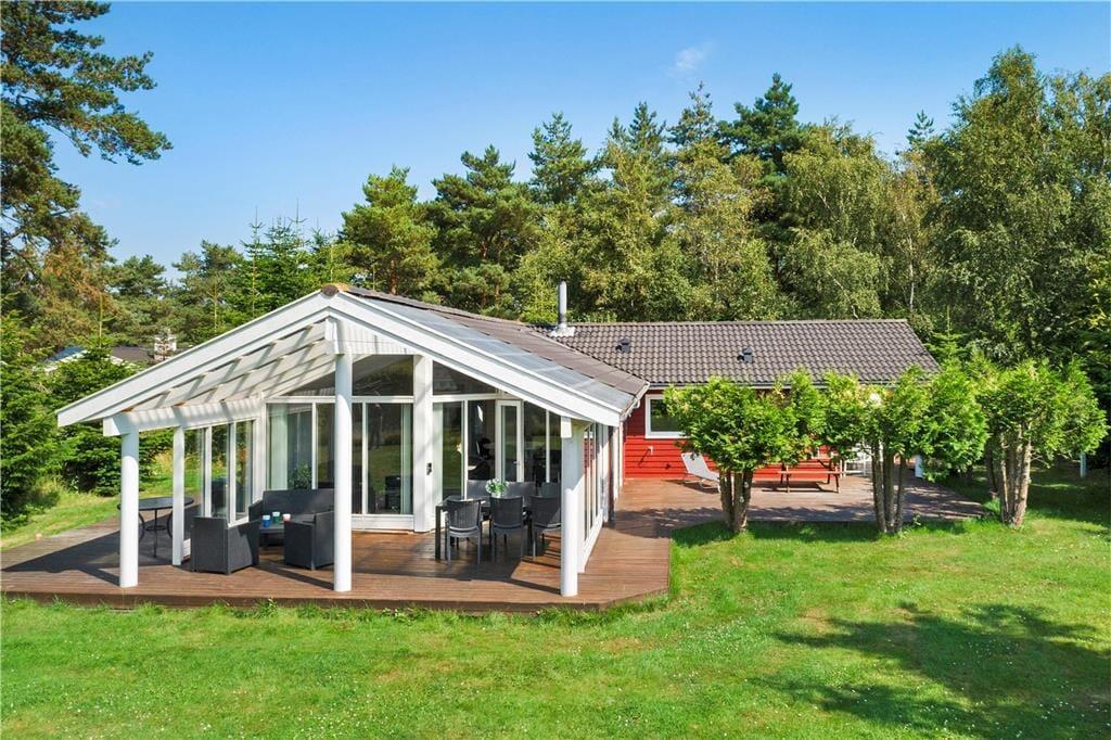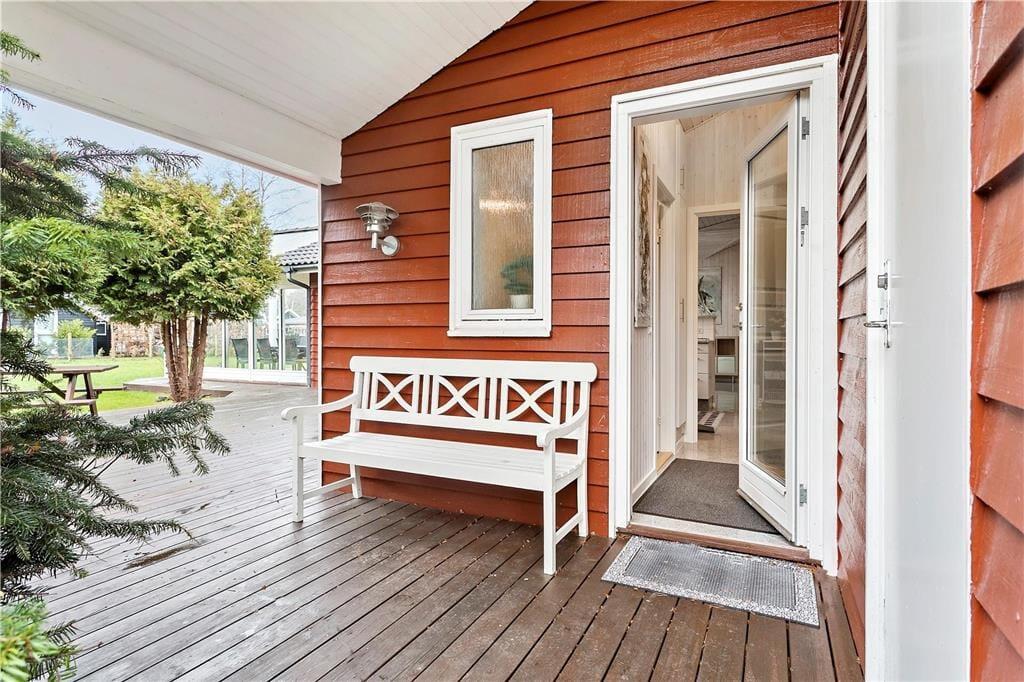 Beliggende på en hyggelig grund, med en super lækker overdækket terrasse, samt en åben træterrasse hvor solen rigtig kan nydes.